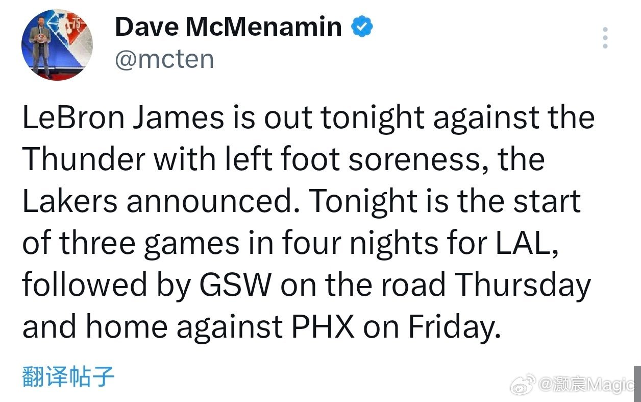 詹姆斯因左脚伤病管理将缺席今天对阵雷霆的比赛。雷霆vs湖人
