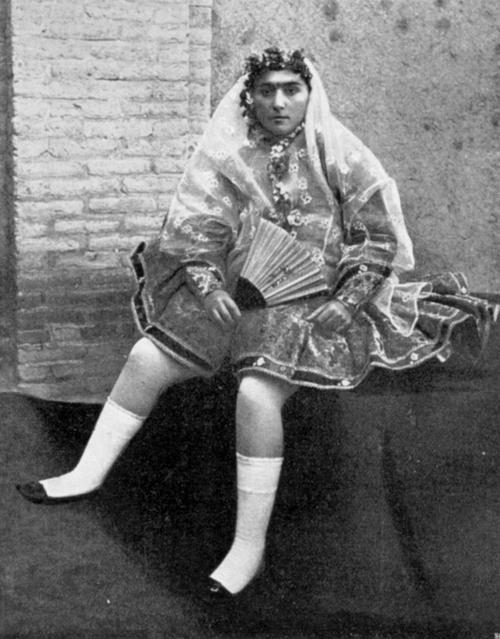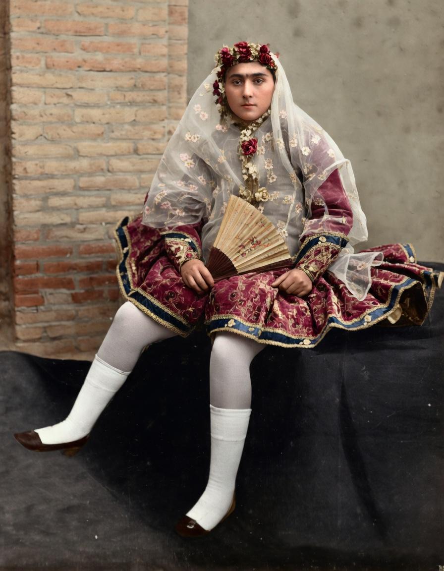这张拍摄于19世纪末的波斯卡扎尔王朝,镜头前看似柔美的女性,实际是一名男扮女装的宫廷美少年,花环、折扇、蕾丝头巾的组合,是当时波斯宫廷美少年的专属女装。 这个人物是卡扎尔王朝宫廷豢养的年轻美少年(娈童),是国王纳赛尔丁·沙阿的宠臣之一,卡扎尔王朝延续了古波斯的宫廷传统,盛行豢养12-18岁的清秀少年,让他们男扮女装、模仿女性仪态,作为国王的贴身宠臣、玩伴,是当时波斯宫廷公开的特权风尚; 纳赛尔丁·沙阿本人是狂热的摄影爱好者,在宫廷设立专属照相馆,拍摄了上百张这类男扮女装的美少年肖像,这张是其中最知名的传世作品之一。