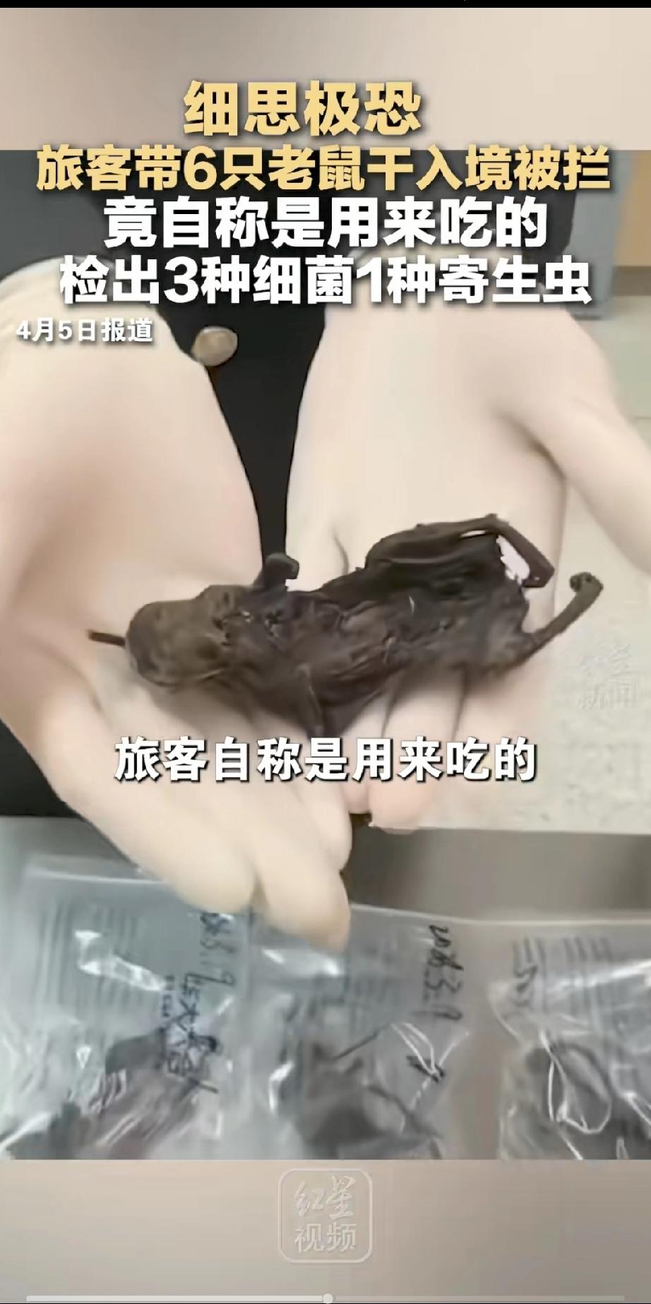 “细思极恐”!真的越想越让人后怕,2026年3月19号,合肥新桥机场海关,工作人员在一名走绿色通道入境旅客的托运行李里,查出了6只黑乎乎干瘪的老鼠干,总共重量才0.205千克,海关工作人员当场询问,这名旅客还一脸淡定地说,带这些东西就是自己吃的。 3月19日这一天,在合肥新桥机场的入境口岸,发生了一件让人听了都觉得头皮发麻的怪事。 海关工作人员在对入境旅客的行李进行例行机检时,发现一个包里的图像轮廓非常古怪,等把行李箱打开一查,里面的东西让在场的人都愣住了:塑料袋里竟然装着6只黑黢黢、干巴巴的东西,仔细一辨认,全是经过风干处理的老鼠肉,加起来总重量也就二两多一点。 面对工作人员的询问,这位旅客表现得异常镇定,甚至有点漫不经心,他没觉得带这东西有什么大不了的,随口解释了一句:“这就是我从国外带回来打算自己吃的。”在他看来,这顶多算是一点特殊的“海外土特产”,带回家尝个鲜而已。 可海关人员心里很清楚,这绝对不是什么小事,老鼠这种生物,平日里钻垃圾堆、爬下水道,是出了名的病菌携带者。 这些来源不明、没经过任何检疫的鼠肉,万一身上带着什么厉害的传染病,那可就麻烦大了,于是,海关立刻把这些鼠肉封存,送到了实验室进行专业检测。 没过多久,实验室的报告出来了,结果让所有人都惊出一身冷汗,这6只风干老鼠肉竟然是“毒性十足”的移动病菌库。 经过鉴定,这些老鼠叫黄胸鼠,而在它们干瘪的身体里,查出了好几种危险的病原体:有能让人高烧不退、甚至导致肾衰竭的钩端螺旋体,有寄生在细胞里让人头痛发热的埃立克体,还有会引发关节剧痛、损伤神经的伯氏疏螺旋体,甚至还发现了专门钻进红细胞、让人寒战贫血的巴贝西虫。 很多人可能觉得,这肉都风干了,回头再下锅煮一煮,什么病菌不都烫死了吗?其实不然。 这种简单的风干根本杀不死这些顽强的微生物,一旦人把它吃进嘴里,或者在处理过程中接触到了体液,这些病菌就极有可能进入人体,引发急性感染,这不仅是带货的人自己拿命在开玩笑,更是在威胁家人和周围邻居的健康。 从法律上讲,我国对进境物品有着严格的规定,不管是生肉还是熟肉,只要是动物制品,或者是动物尸体和标本,统统都在禁止携带入境的名单上。 这些东西来源不清,没经过正规的检疫流程,存在巨大的生物安全隐患,那位旅客自以为走“绿色通道”能神不知鬼不觉地带进来,其实是打错了算盘,绿色通道是给守规矩、没带违禁品的人准备的,不是违禁品的“避风港”。 目前,这6只充满了病菌的鼠肉已经被海关依法进行了销毁处理,这位旅客虽然觉得自己只是带点吃的,但他的行为已经违反了出入境检验检疫的法规,后续免不了要接受处罚。 这事在网上传开后,网友们也纷纷感叹:“这口味也实在是太重了,怎么想的?”“拿老鼠肉当宝贝带回国,这心可真够大的。” 大家说得没错,公共卫生安全真的没有小事,老鼠本身就是各种细菌和寄生虫的天然宿主,任何未经检疫的野味,都可能成为戳破国家生态屏障的尖刀。 合肥机场拦截下的这6只鼠干,看似不起眼,重量也轻,但它背后藏着的风险却大得惊人,这也在提醒每一个出国旅游或探亲的人:回国的时候,别光想着带点“稀罕特产”或者“异域野味”。 在收拾行李前,一定要先查查海关的禁带名录,该申报的申报,该留下的留下。 别因为一时的口腹之欲或者侥幸心理,给自己招来法律麻烦,更给国家的公共安全添堵,守好国门安全,其实也是在保护我们每一个人的健康生活。 对此你怎么看? 信源:大象新闻