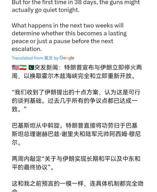 这!这!这!简直不敢相信,特朗普单方面宣布停火两周!4月8日,根据外媒报道,外媒称,特朗普宣布与伊朗停火两周,立即生效,以换取霍尔木兹海峡的完全和立即重新开放。特朗普表示,我们收到了伊朗提出的10点建议,认为这是谈判的可行基础。几乎所有过去争论点都已达成一致。 特朗普突然宣布与伊朗停火两周,看着意外其实全是各方熬到极限的必然结果。 这场38天的冲突里,没人是赢家,停火更像是给紧绷的局势踩了脚刹车,背后藏着太多摆不上台面的算计和不得不认的现实。 先看美国这边,早就没了开战初期的底气。 38天里,美军付出了13人死亡、365人受伤的代价,这是20年来美军战机首次被敌方击落,搜救行动还差点酿成灾难性损失。 装备消耗更是触目惊心,日均军费开销近10亿美元,“战斧”导弹狂射近千枚,耗掉了四分之一库存,按这速度撑不了四个月。 更要命的是国内压力,西得克萨斯中质原油价格飙到115美元一桶,通胀压力持续攀升,民调显示66%的美国人要求立即停火,16%的共和党基本盘已经后悔支持特朗普。 对于正盯着大选的特朗普来说,再打下去要么变成战争犯,要么失去选民,停火是唯一的退路。 伊朗这边看着硬气,其实也扛着不小压力。 虽然用不对称打法让美军吃了苦头,靠山地民兵和低成本无人机拖成消耗战,但长期封锁霍尔木兹海峡也断了自己的财路。 伊朗每天100万桶原油出口全靠这条海峡,制裁下的经济本就艰难,持续冲突只会让民生压力更大。 所以伊方提出的10点建议,核心都是解决实际利益:解除所有一级和二级制裁,解冻海外资产,要求美国赔偿战争损失,这些都是伊朗急需的经济松绑。 而要求主导霍尔木兹海峡通行权、保留铀浓缩活动,则是守住国家安全的底线。 巴基斯坦能促成这次停火,绝非偶然。 它既和伊朗保持着邻国间的贸易与安全合作,又与美国有着长期军事经济联系,立场中立不偏不倚,正好能给双方一个挽回面子的出口。 更关键的是,巴基斯坦的调解背后还有中俄的外交支撑,俄罗斯外长拉夫罗夫先联系伊朗再致电王毅,中方提出的五点倡议也得到欧盟认可,形成了一张多方支持的斡旋网络。 这种情况下,巴基斯坦出面牵头,既不会让美国觉得丢份,也不会让伊朗感到被孤立,成了最合适的中间人。 霍尔木兹海峡的战略地位,是双方愿意坐下来谈的核心筹码。 这条水道承载着全球31%-34%的海运原油贸易,每天有1850万桶石油及液体产品经过,亚洲75%的能源进口都要走这里。 美国需要海峡重新开放来平抑油价、缓解国内通胀,伊朗则握着这条“能源咽喉”换来了谈判主动权。 停火协议里“立即重新开放海峡”的约定,本质是双方的利益交换:美国得到能源通道的安全,伊朗得到谈判的资本。 伊朗提出的10点建议,看似苛刻却精准命中了双方的核心争议点。 从接受伊朗铀浓缩权利,到要求美国撤出地区作战部队;从终止联合国相关决议,到建立伊朗主导的海峡通行机制,这些都是过去十几年美伊谈判的死结。 现在特朗普愿意将其作为谈判基础,说明美方已经放弃了“全面压制”的幻想,而伊朗同意停火不谈推翻美方诉求,也体现了务实的妥协。 不过这两周停火更像是“试探期”,真正的硬仗还在后面。 协议细节的敲定难度极大,美国国内有以色列和沙特的反对声音,以色列一直视伊朗核问题为心腹大患,沙特也刚拦截过弹道导弹。 伊朗内部对美国的不信任根深蒂固,明确表示若谈判失败将重启战斗。 两周时间要确定赔偿金额、撤军时间表、制裁解除步骤等关键问题,时间紧任务重。 更重要的是,双方的根本矛盾并未消失。 美国想保住中东影响力,伊朗想打破孤立局面,地区代理人冲突的隐患还在。 特朗普的停火决策带着强烈的选举考量,一旦选举需求变化,政策随时可能调整。 而伊朗也不会轻易放弃既得利益,10点建议里要求安理会决议背书,就是为了让协议具有约束力,防止美方出尔反尔。 这场突然的停火,不是和平的终点,只是阶段性的妥协。 它既反映了现代战争没有赢家的现实,也暴露了大国博弈背后的利益算计。 接下来的15天里,伊斯兰堡的谈判桌上,每一个细节的拉扯都将影响中东局势的走向。 但无论结果如何,这次停火至少证明,再激烈的冲突也有通过外交解决的可能,这或许是38天战火中最值得期待的信号。