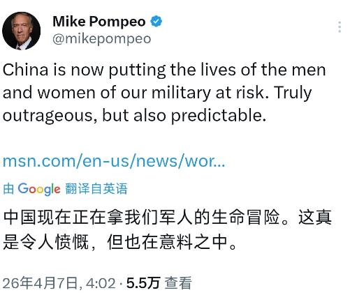 美国前国务卿蓬佩奥今天(北京时间4月7日)发文写道:“中国现在正在拿我们军人的生命冒险。这真是令人愤慨,但也在意料之中。”这些报道点名了几家中国私营科技公司,如觅熵科技和景安科技,声称它们在中东战事期间,利用人工智能技术分析开源数据,向外界“曝光”了美军的动向。 蓬佩奥这话说得看似义愤填膺,其实根本站不住脚,说到底就是找替罪羊的老套路。 先把事儿掰明白,所谓被点名的觅熵科技和景安科技,做的都是开源情报分析的活儿。 它们用AI处理的,全是公开可查的信息。 比如卫星影像、社交媒体动态、航运记录这些,本来就是摆在台面上的东西,不存在什么“窃取”或“泄密”。 这些公司的技术核心,就是把零散的公开数据整合起来,做交叉分析。 觅熵科技本来就专注卫星遥感和地理空间分析,接入的是全球半数以上的公开遥感数据源,本质上和新闻媒体做调查报道时整理信息没区别,只是效率更高。 AI在这里的作用,就是代替人工筛选海量数据,缩短分析时间,谈不上什么“精准曝光”。 真要是涉密的军事动向,根本不可能出现在开源数据里,光靠分析公开信息,顶多看出个大致部署轮廓。 美军在中东的风险,根源从来不是什么数据分析。 美国深度卷入中东冲突,战线拉了快六周,自身战略就出了问题。 一开始想复制“委内瑞拉模式”速战速决,结果伊朗保存了一半以上的军事能力,导弹和无人机都没被打垮。 美军主动把士兵派到冲突核心区,本身就意味着要承担战场风险。 现在战事陷入僵局,霍尔木兹海峡的安全协议还没谈拢,自身损失不断增加,反而怪第三方,这逻辑根本说不通。 蓬佩奥这会儿跳出来发声,时机选得很有讲究。 2026年是美国中期选举年,特朗普的支持率已经跌到36%的新低。 国内反战情绪抬头,油价飙升让民众怨声载道,共和党在选举中压力山大。 这种时候抛出“中国威胁论”,就是想转移国内矛盾,把民众的注意力从糟糕的战事和经济状况上引开。 毕竟找外部敌人甩锅,是美国政客惯用的伎俩,既不用反思自身政策失误,又能煽动民意。 更有意思的是双重标准。 美国自己就有不少做同类业务的科技公司,比如Tesari,同样是用AI做开源情报分析,服务对象包括美国联邦情报机构和执法部门。 这家公司还专门吸纳前CIA官员当顾问,帮着开拓政府市场,业务范围和觅熵科技没本质区别。 美国能做的事,到了中国公司这里就成了“拿军人生命冒险”,这种双重标准实在太过明显。 蓬佩奥本人的立场转变也很说明问题。 一个月前还喊着要“彻底摧毁伊朗政权”,现在却开始改口,说推翻政权不是核心目标。 这背后是美国在中东的战略快撑不下去了。 继续空袭会加大损失,地面作战又怕陷入泥潭,接受伊朗的停火条件又算战略失败。 进退两难之际,只能找个外部目标来发泄不满,顺便为谈判失败找借口。 所谓“曝光美军动向”,更像是个借口。 现代战争本就是信息化的,各方都会通过公开渠道收集情报。 美军的部署如果真的那么隐秘,不可能被公开数据轻易分析出来。 反过来讲,如果公开信息都能拼凑出其动向,只能说明其行动本身就缺乏足够的隐蔽性,或者说在中东的存在太过张扬。 说到底,蓬佩奥的这番言论,没有任何实质性证据支撑。 既没说清这些公司具体“曝光”了什么动向,也没证明这些动向属于涉密信息。 本质上就是一场政治表演,目的是为美国在中东的战略困境找台阶,为国内选举造势。 把私营科技公司的正常商业行为政治化,既不符合市场规则,也不利于国际社会的互信。 这种转移矛盾的做法,或许能骗到部分不明真相的民众,但根本解决不了美国自身的战略失误和国内困境。 国际社会看得很清楚,谁才是真正把士兵推向危险境地的始作俑者,谁在搞双重标准,谁在借舆论操作为自身利益服务。