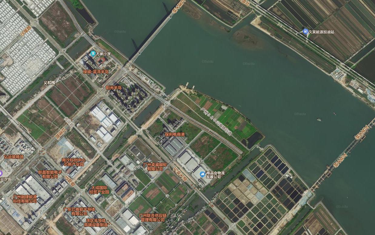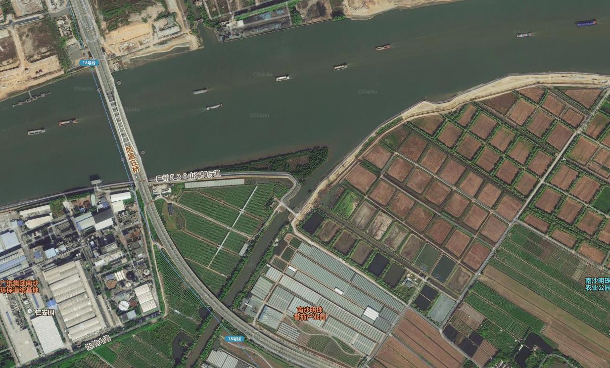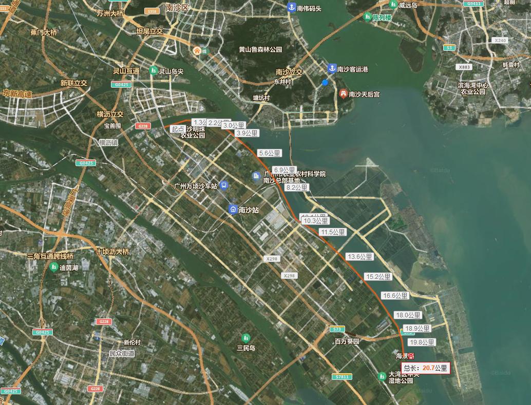 目前地图软件上,已经可以看到广州520山海骑行线的标注,可以看到基本上就是从蕉门出发,结合凤凰一桥二桥三桥新建的慢行系统,然后沿着万顷沙岛北岸,往东之后,一直沿着万顷沙岛东岸往南。最后到二十一涌。