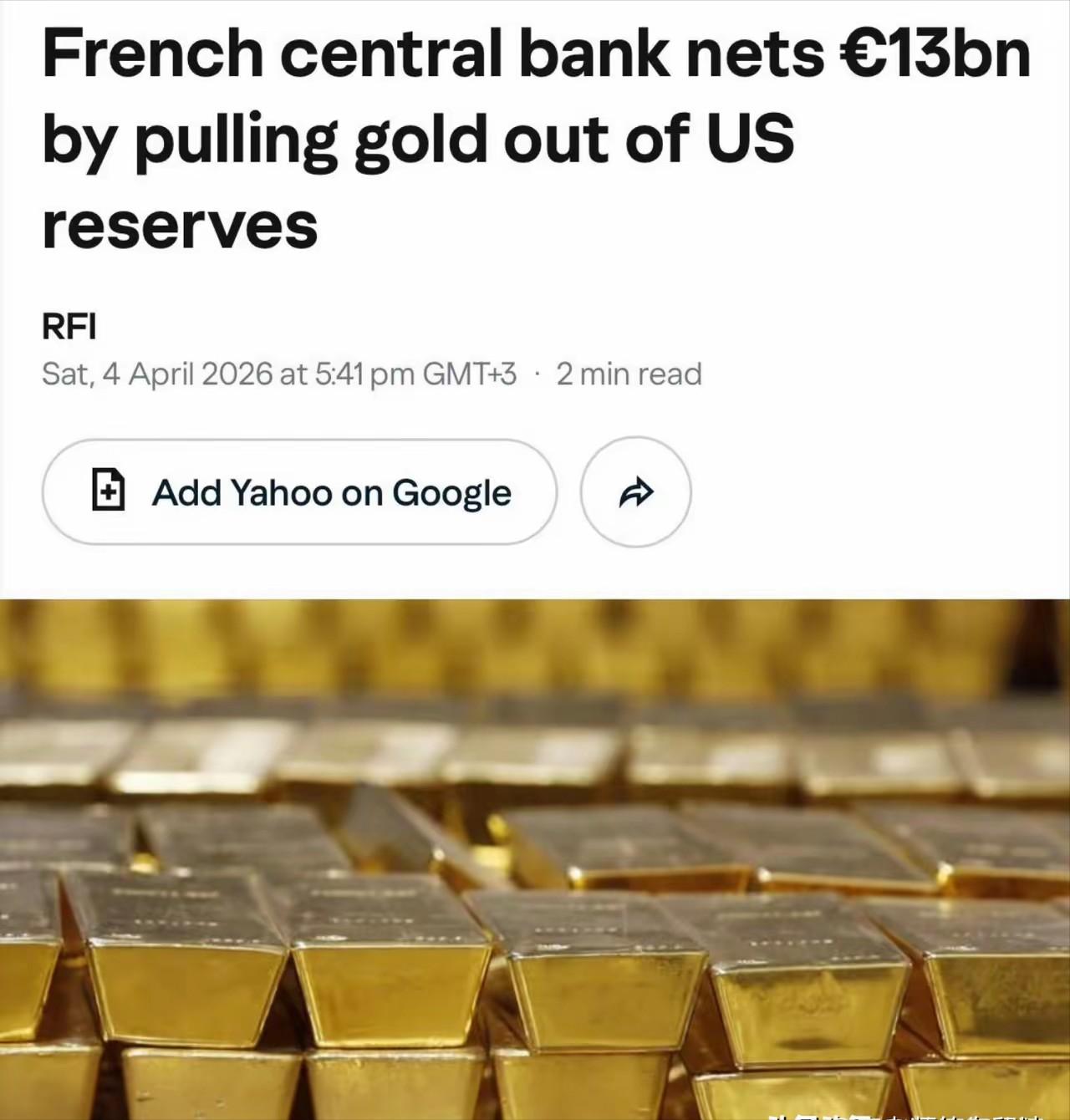 近日,法国央行出售了129吨存放在美国的黄金,获利130亿欧元,并表示,目前所有法国央行拥有的黄金均已存放在法国国内,未来也不会将黄金存放在国外了