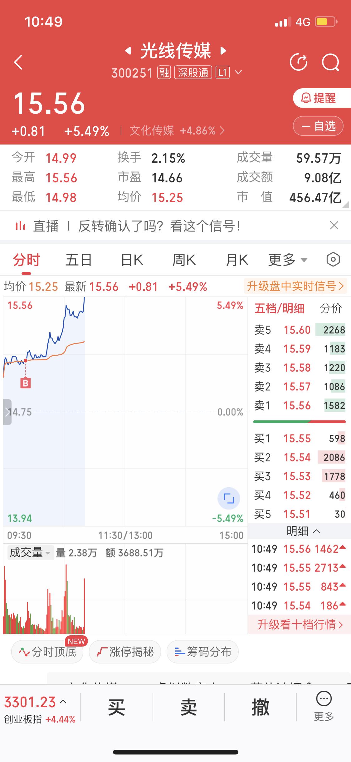 今天这大盘简直跟坐火箭似的起飞啦!蓝色光标直接涨停,可惜早上那位置太高,我没敢进。不过我转头进了低位横盘震荡老久的光线传媒。