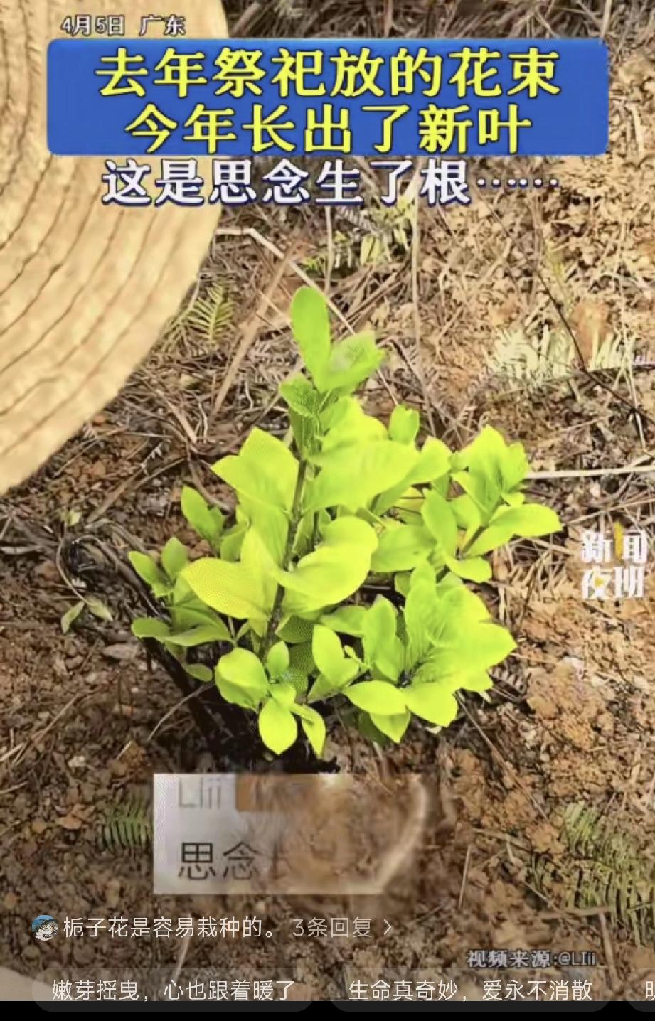 广东,女子清明节去扫墓。突然,她发现去年放的一束花,今年长出了枝芽。网友: 枯木逢春,是思念在生长。