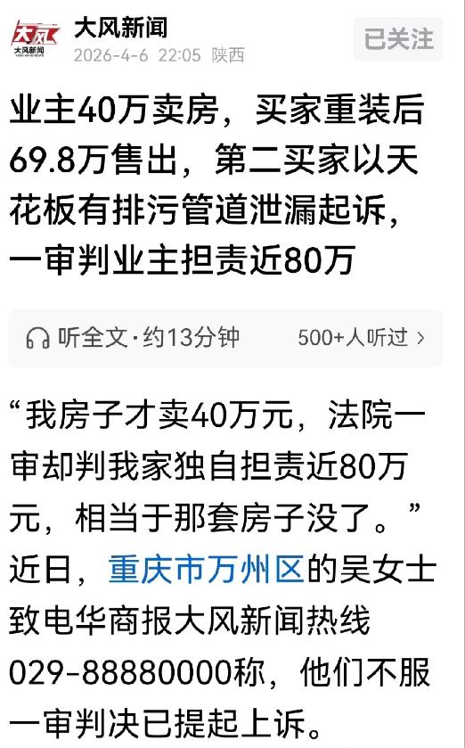 重庆万州,女子因搬家以40万的价格,卖掉了154平的学区房,买家装修后,以69.8万卖给了另一买家。万万没想到,过户7个月后,女子和第一买家,双双被第二个买主告上法庭,称房子的刻意隐瞒重要事实,使她受到欺诈,要求赔偿损失。岂料,法院一审排除第一买主,要求女子独自返还69.8万元购房款,和其他费用,总共大约80万元。女子不服判决,自己40万卖掉的房子,如今却要赔出将近80万,等于搭进去一套房子? 重庆的吴女士万万没想到,自己原本高高兴兴卖了套房,最后不仅一分钱没赚着,反而背上了将近80万的巨额债务。 这事说起来像天方夜谭,但就在万州区法院的判决书里,白纸黑字写得清清楚楚,她怎么也想不通,自己明明只拿了40万的房款,怎么到头来得赔出去双倍的钱? 2024年,吴女士在重庆有一套154平米的大房子,位置不错,还是学区房,因为她打算搬家,就通过中介把这房子挂了出去。 没多久,一位姓朱的女士找上门来,两人谈妥了价格,以40万块钱成交,吴女士觉得这价虽然不算太高,但能赶紧变现也行,于是双方爽快地办了过户,钱货两清,她以为这事就算彻底翻篇了。 可她哪知道,这位买家朱女士可不是为了自己住,朱女士接手房子后,立刻大刀阔斧地装修了一番,把房子弄得光鲜亮丽,转手就以69.8万的高价卖给了第三个人:向女士。 这短短的时间里,朱女士低买高卖,中间轻轻松松赚了将近30万。 第三位买家向女士高高兴兴地搬进了这套学区房,本以为给孩子找了个好环境,结果住进去没几天就傻眼了。 客厅天花板开始不停地往下滴水,墙皮被泡得一块块脱落,地板也跟着受潮鼓包,向女士找来工人拆开吊顶一检查,差点没气晕过去:天花板里竟然横着整栋楼的公共排污管,而且这管子早就烂得不成样子,污水一直往外渗。 更让她愤怒的是,这根本不是什么意外,她发现之前的装修完全是为了打“掩护”,那位中间买家朱女士在卖房前,明明知道管道漏水,却故意用新吊顶把烂管子盖住,甚至还用塑料薄膜把漏水的地方缠了几圈,表面上糊弄得漂漂亮亮,实际上就是为了掩盖这个致命的缺陷,好把房子高价甩给下家。 花了大价钱买了个“粪水房”,向女士一气之下,把吴女士、朱女士还有中介统统告上了法庭,她要求撤销合同,把钱退回来,还要赔偿她的所有损失。 官司一打,最崩溃的是第一任房主吴女士,她觉得这事跟自己一点关系都没有:房子我早卖了,卖的时候我就拿了40万,后面朱女士怎么装修、怎么忽悠人、怎么卖到将近70万,那都是她的事,凭啥让我来承担责任? 可法院的调查结果却给了吴女士沉重一击,法院发现,吴女士其实早就知道这房子有漏水的问题。 早在她把房子租出去的时候,就因为管道渗漏跟楼下的宾馆闹过矛盾,甚至还惊动了派出所,这就证明,吴女士在卖房时就隐瞒了重大的房屋缺陷。 最关键的法律判定来了:法院认为,朱女士虽然是中间买家,但在整个交易链条里,她被视为受吴女士委托的代理人,朱女士那种故意掩盖漏水的欺诈行为,在法律后果上要由委托人吴女士来扛。 到了2026年1月,法院的一审判决下来了:向女士的购房合同被撤销,吴女士得返还全部购房款69.8万元。 但这还没完,还得加上利息、过户的税费、中介费、律师费等等,杂七杂八算下来,总金额快到80万了,而那个中间赚差价、搞装修掩盖漏水的朱女士,竟然在这次判决里被免除了赔偿责任。 吴女士当这辈子都没见过这么离谱的事:自己40万卖的房,现在要吐出80万,这相当于房子白给人家住了不说,自己还得倒贴一套房的钱,她觉得自己简直就是被朱女士和这个官司给坑惨了。 现在,吴女士已经提起了上诉,她认为开发商的设计问题不该由她一个人买单,更重要的是,朱女士拿走了大部分房款,凭啥让她这个只拿了40万的人赔80万? 这起案子也给咱们所有买卖二手房的人敲了个响亮的警钟,房子的隐蔽毛病,特别是漏水、管线这种大事,卖房的时候一定要实话说,千万别觉得能瞒过去。 一旦被认定为故意欺诈,那后果可能就是像吴女士这样,不仅生意做砸了,连家底都要赔个精光。 买房的人也得长个心眼,装修得再漂亮的房子,也得仔细查查底细,别等签了字才发现掉进了大坑,这就是典型的“卖房变破产”,教训实在是太惨痛了。 对此你怎么看? 信源:都市现场