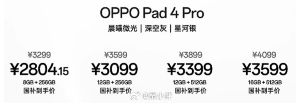 OPPO Pad4 Pro涨价300-4008+256G,原3299,现359912+256G,原3599,现399912+512G,原3899,现429916+512G,原4099,现4499