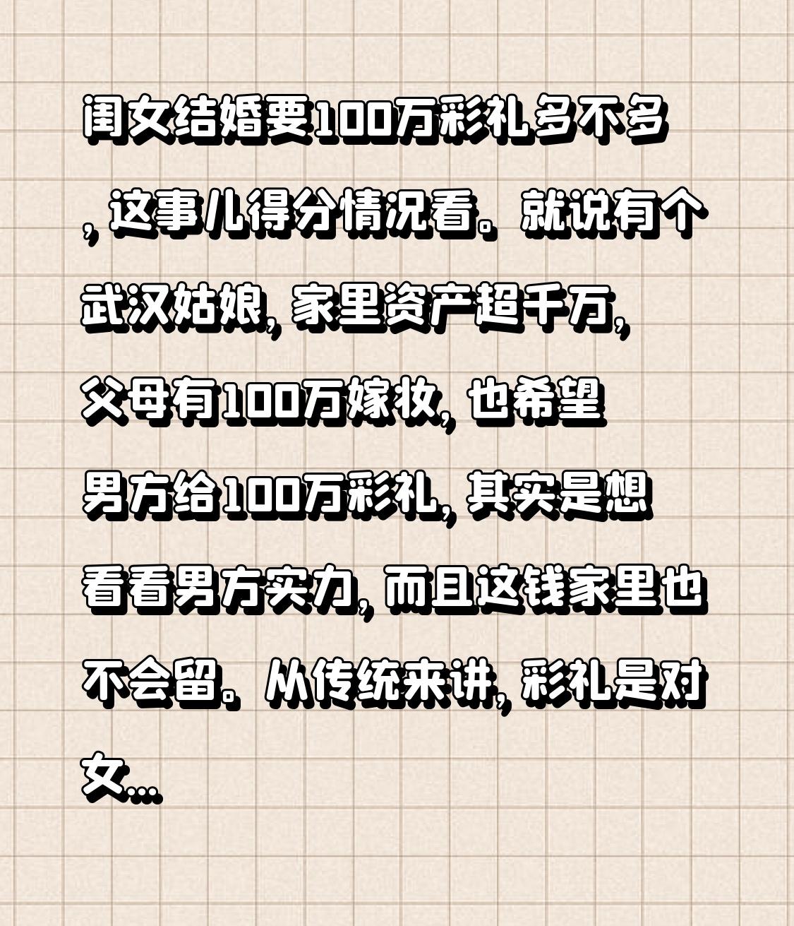 闺女结婚要100万彩礼多不多,这事儿得分情况看。就说有个武汉姑娘,家里资产超千万,父母有100万嫁妆,也希望男方给100万彩礼,其实是想看看男方实力,而且这钱家里也不会留。