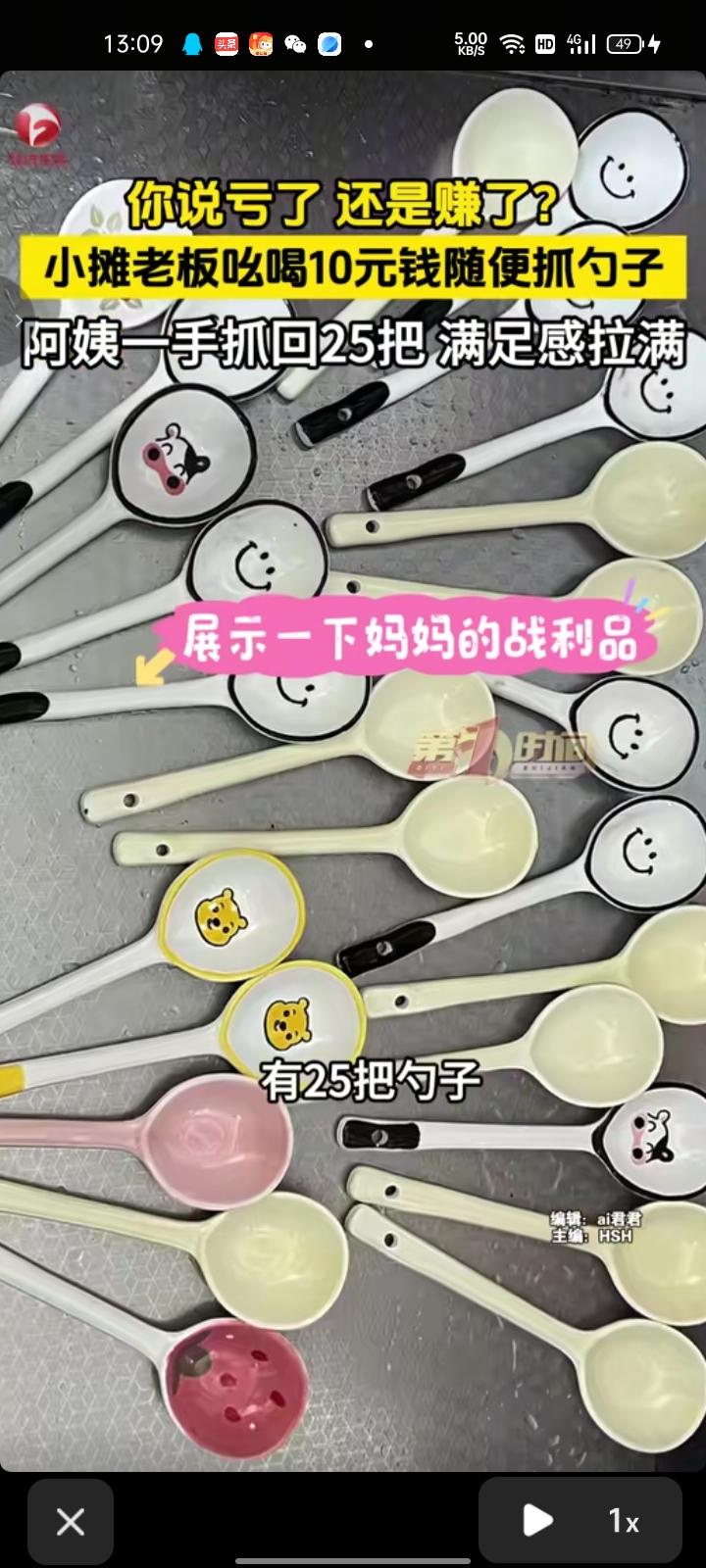 4月6日,江西景德镇。何女士跟老妈逛街时,遇到小摊老板吆喝十块钱随便抓勺子。随后