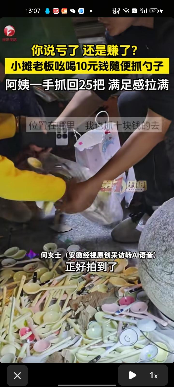 4月6日,江西景德镇。何女士跟老妈逛街时,遇到小摊老板吆喝十块钱随便抓勺子。随后,老妈有点蠢蠢欲动想挑战,没想到一手抓了25把,满足感拉满。估计摊主怎么也没想到,肯定会觉得亏本了