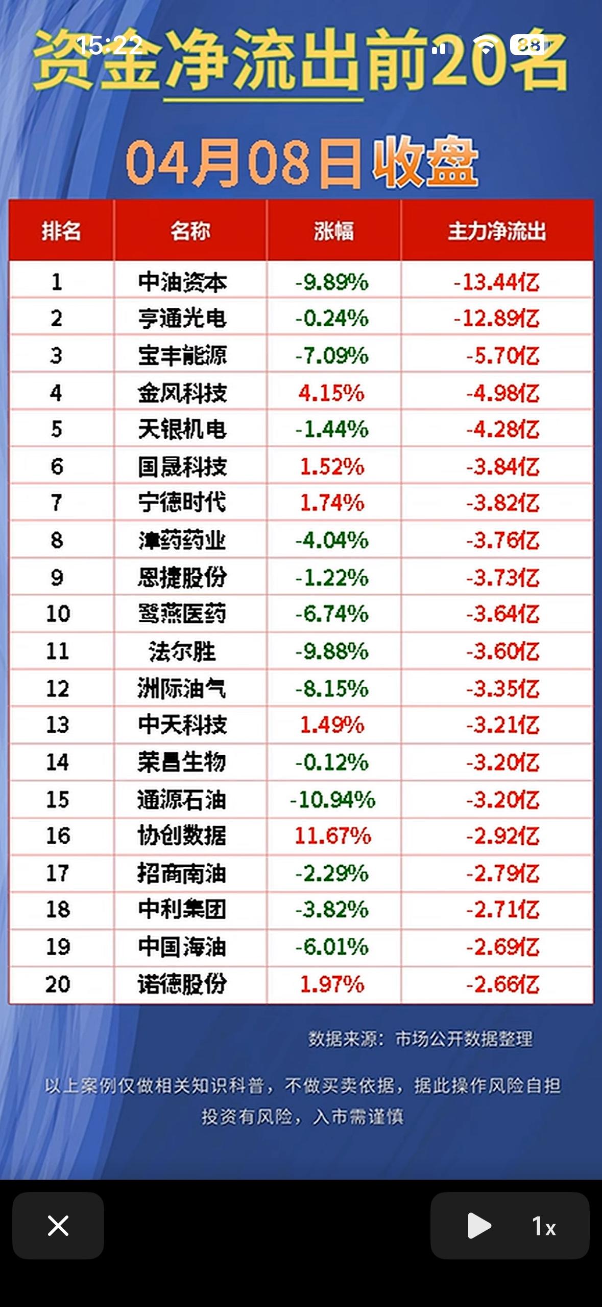 4月8日的A股市场风云变幻!先看4月7日,A股走出“缩量修复、尾盘稳盘”行情,上证指数精准收在3890.16点。但到了4月8日中午收盘,情况突变,百只A股主力资金流出。亨通光电以9.55亿元净流出额居首,兆易创新、中油资本分别流出8.96亿和7亿元。光通信、半导体、医药等细分领域成主力调仓主阵地,像长飞光纤净流出3.24亿元。不过,历史上类似情况也有,2021年宁德时代、2023年大消费板块都曾出现资金流出后又回流的情况。想抓住投资机会的,可得密切关注这些资金流向的变化!