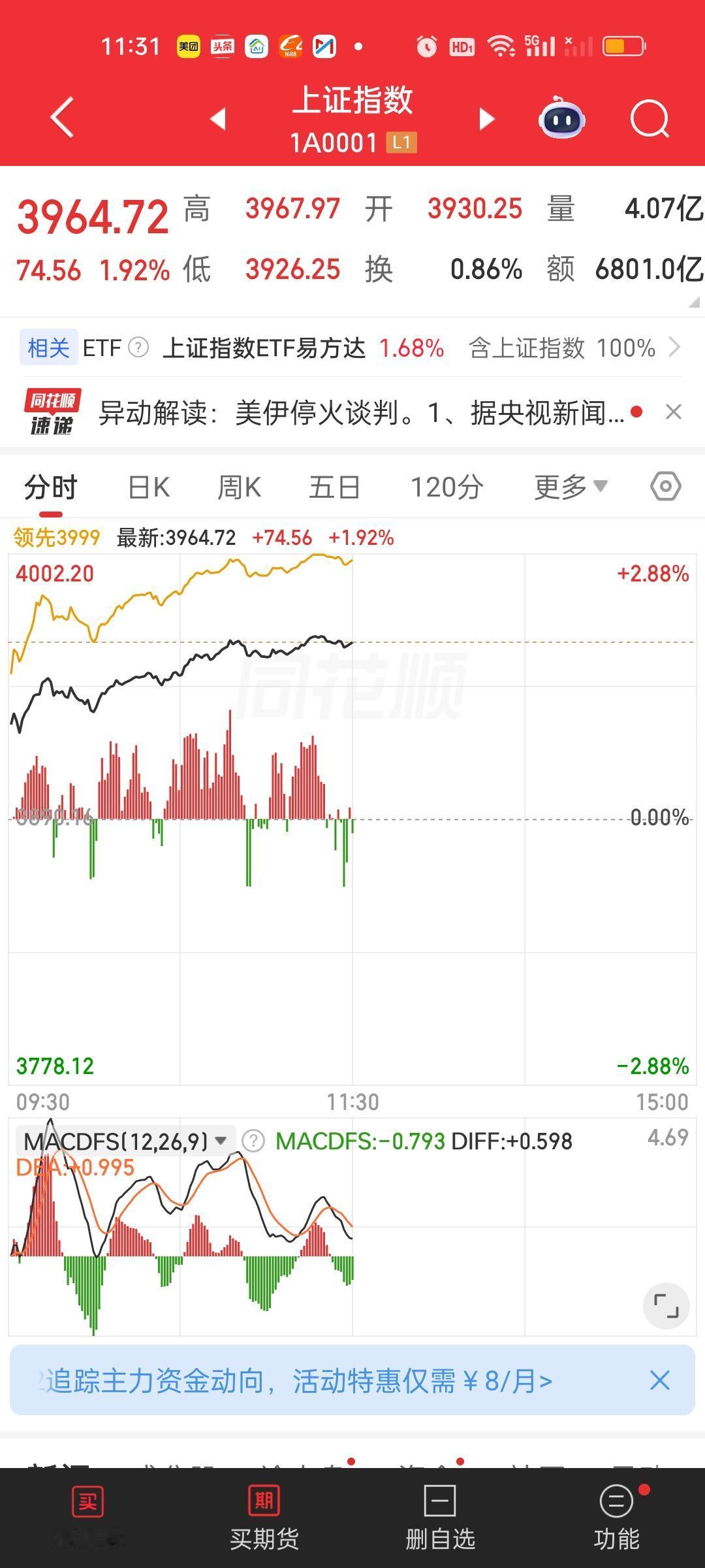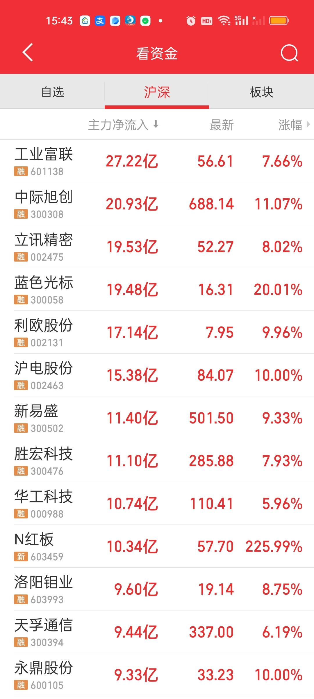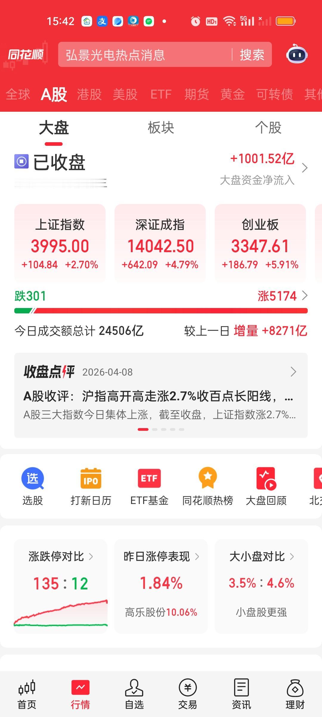 收盘了,今天赚钱效应非常好,大盘一整天都在持续强势表现。可以说是整个2026年赚钱最好的一天。上证指数大涨超100点。深指涨了642点。许多板块ETF的涨幅都在6%以上。更别提板块里面的个股了。但前面坑挖的比较深,指望一天就填平也不现实。前面我就说过三月负责挖坑,四月负责填坑,四月行情不会差。 上午收盘成交量放量4746亿,大盘资金净流入672亿,有超过5000家个股上涨,涨跌停比90:10,全天收盘成交量放量8271亿,大盘资金净流入1001亿,有5174家上涨,涨跌停比135:12。这说明下午实际上放量8271-4746=3525亿,大盘资金净流入1001-672=329亿。涨停家数也增加了45家。 主力资金净流入超10亿的个股比上午增加了4家,中油资本和亨通光电净流出资金超10亿。