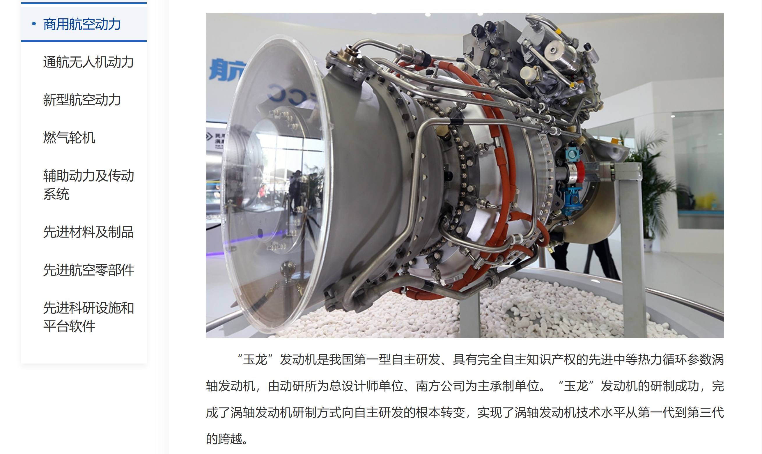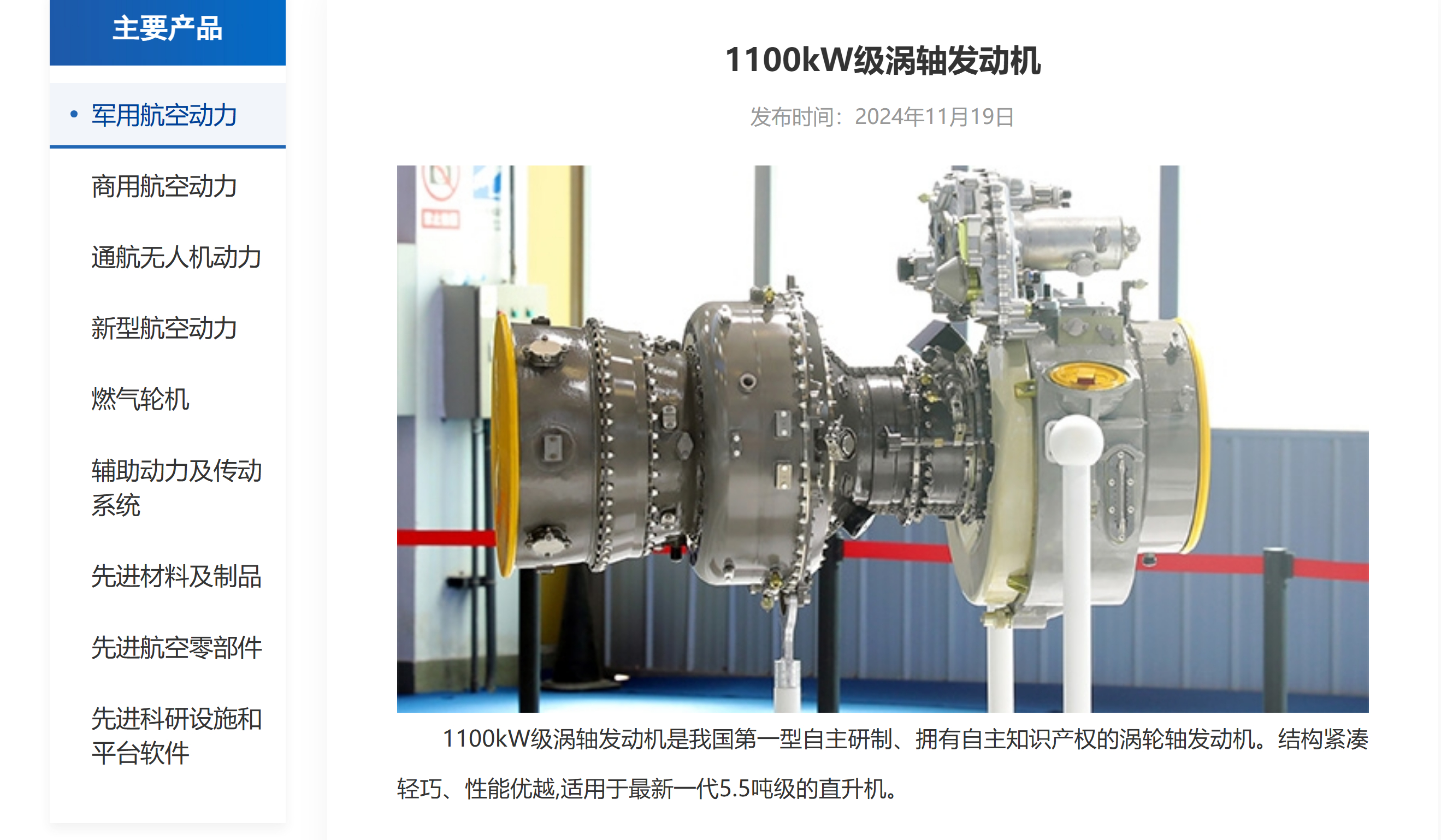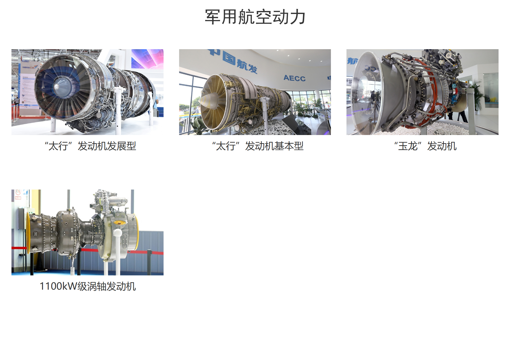 AECC官网产品目录中的 “军用航空动力” 栏目,收录有4型航发产品,包括太行基础型、太行改进型、玉龙涡轴发动机和1100KW级涡轴发动机