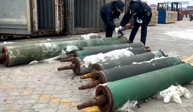 集装箱里层层货物底下,竟然藏了8根旧得不成样子的胶辊,加起来足有1.68吨重。