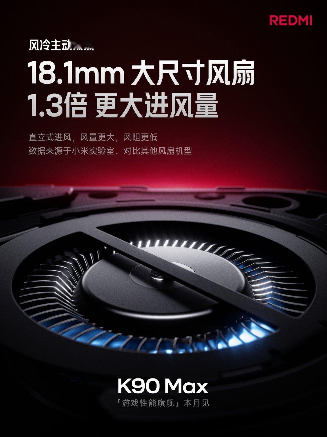 根据官方目前公布的信息,REDMI K90 Max 采用全新风冷散热系统,搭载大尺寸风扇,直径超主流方案 6%,直立式进风设计,前倾扇叶增压聚风,每分钟风量可达 0.42CFM,是友商的 1.3 倍。整机支持 IP66/IP68/IP69 防尘防水,现已开启预约。