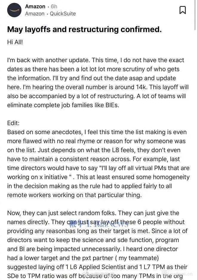 但据内部爆料,本次裁员决策方式令人“后背发凉”——完全随机,没有逻辑。管理层只需要“随机点名”确定裁员名单,无业绩或项目依据,被裁者甚至无法申诉。有案例显示,原本只需要裁2个人,结果因为某个director“想保留SDE和科学家”,最后裁了8个L4/L5的BA和L6的PM。多出来的6个人,纯粹是为本应被裁的技术岗挡了枪。更讽刺的是,这些被点名的PM,连申诉的机会都没有。当裁员变成一场“抽签”,底下员工唯一能做的,就是祈祷自己不在那个名单上。