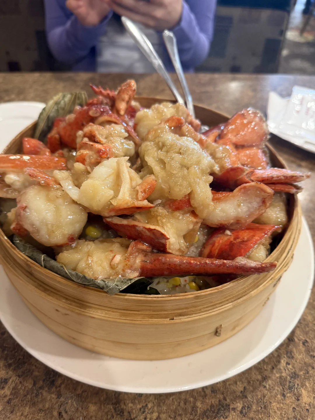 我们去的那天刚好是周末,大堂坐满了人,很忙碌,从服务员拿上来让我们看到的活龙虾,到这盆龙虾饭上桌大概只用了5分钟,这速度快的令人怀疑,事实上,味道有些奇怪,一股很重的氨水味,所以真的有些怀疑我们吃到的龙虾是不是5分钟前看到的那只活龙虾[害羞R],以前我们吃的龙虾饭真的很好吃,现在真不一定了[哭惹R]