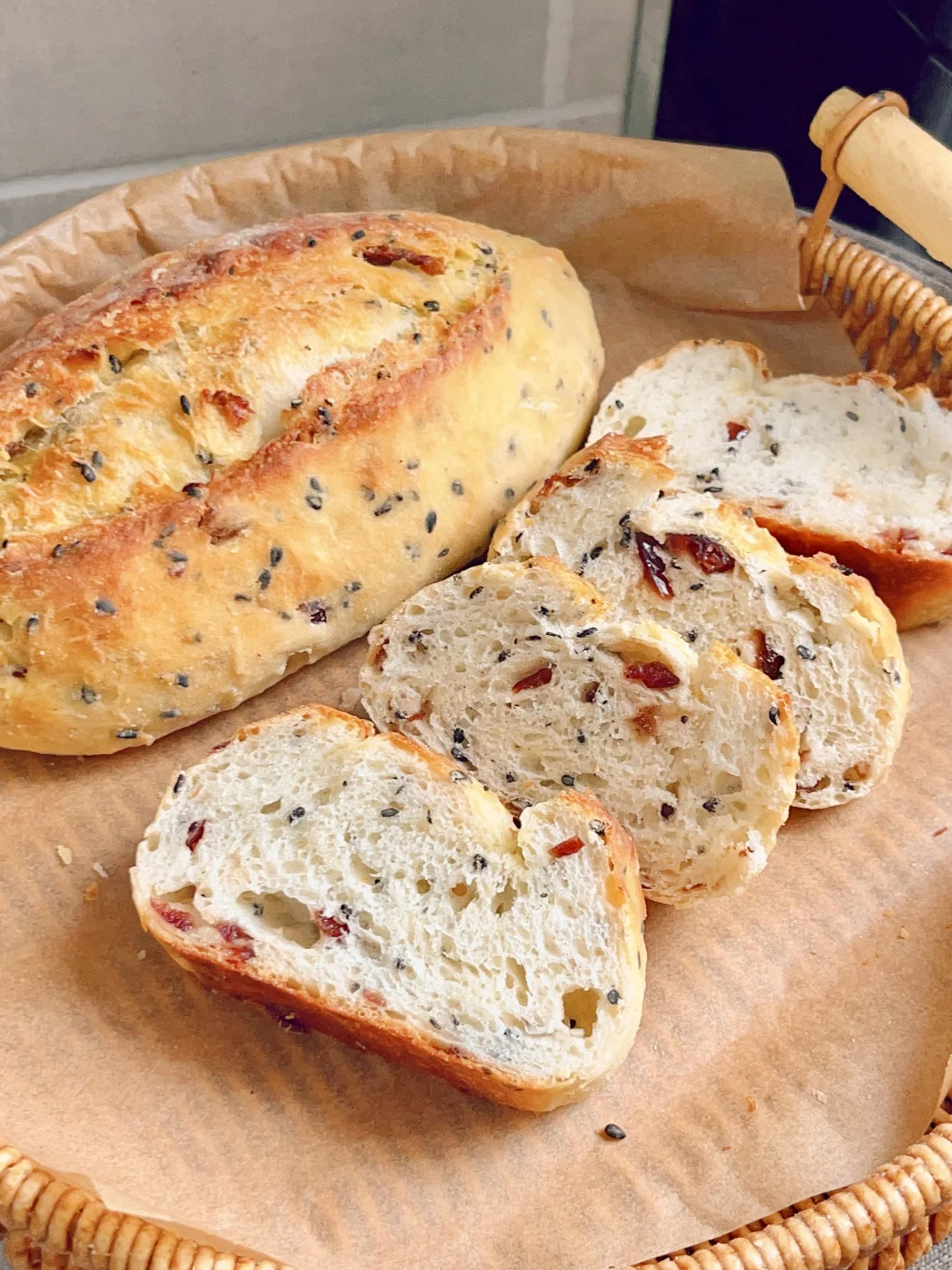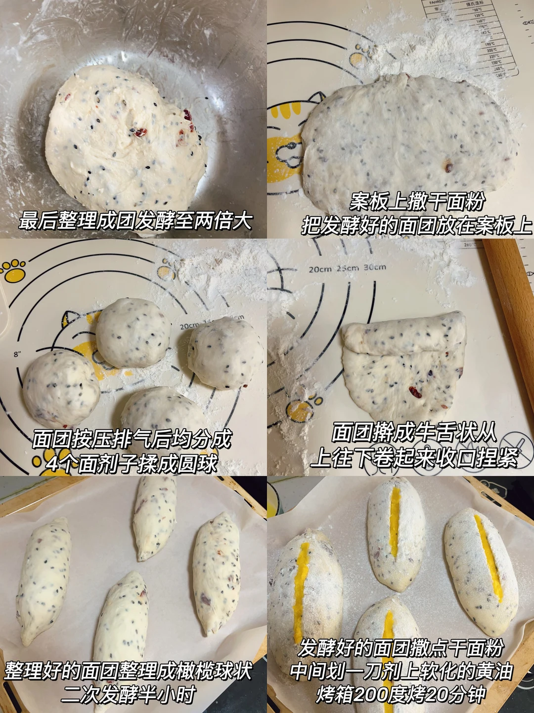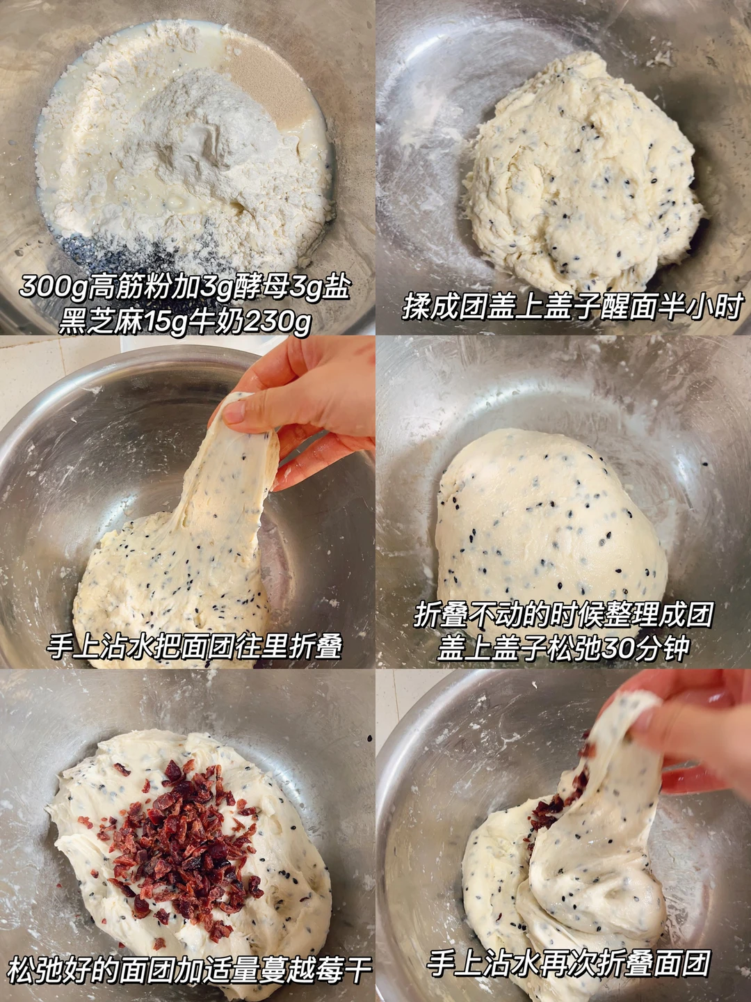 300高筋面粉、3g酵母、3g盐、15g黑芝麻、230g牛奶、蔓越莓适量