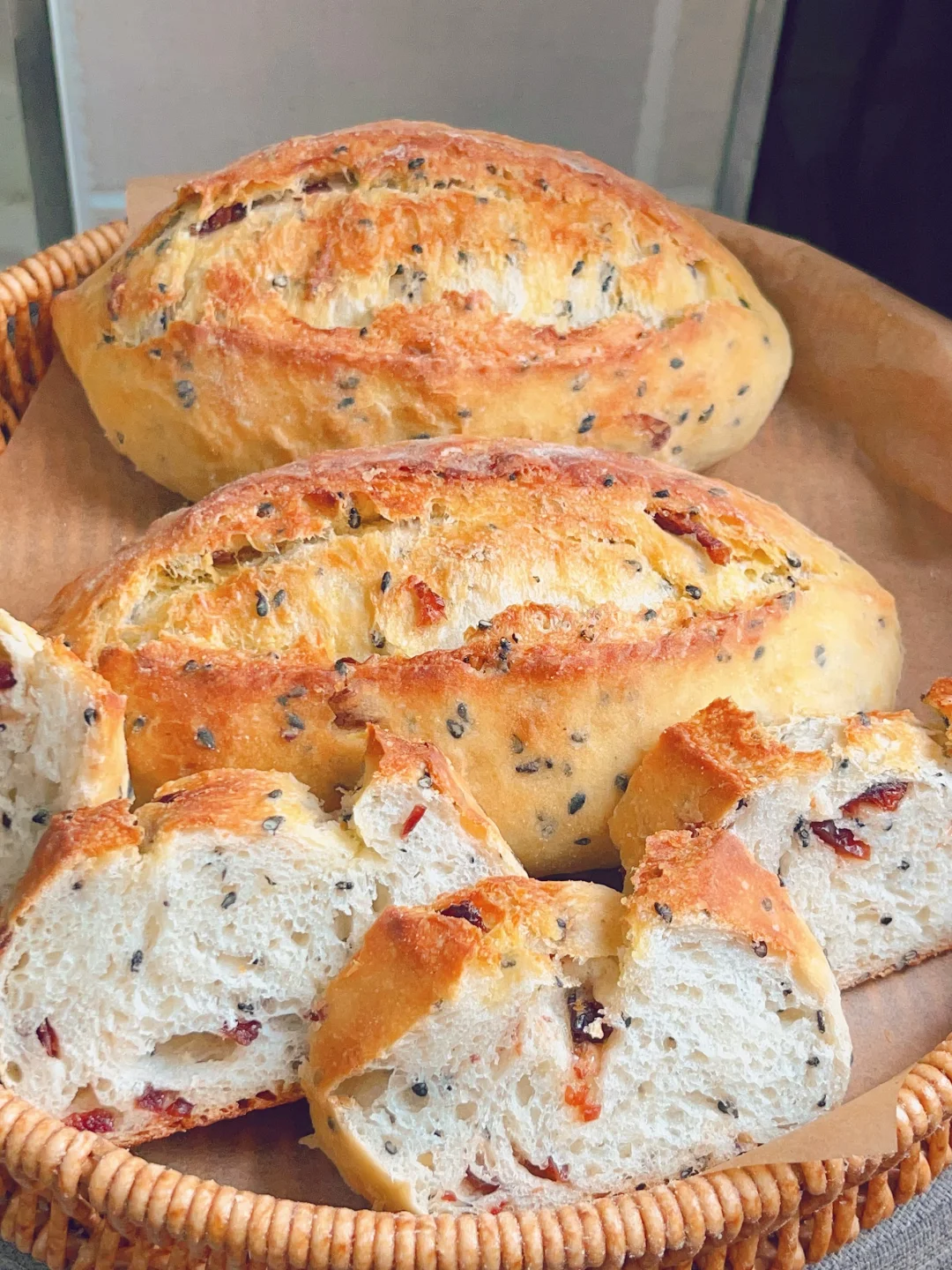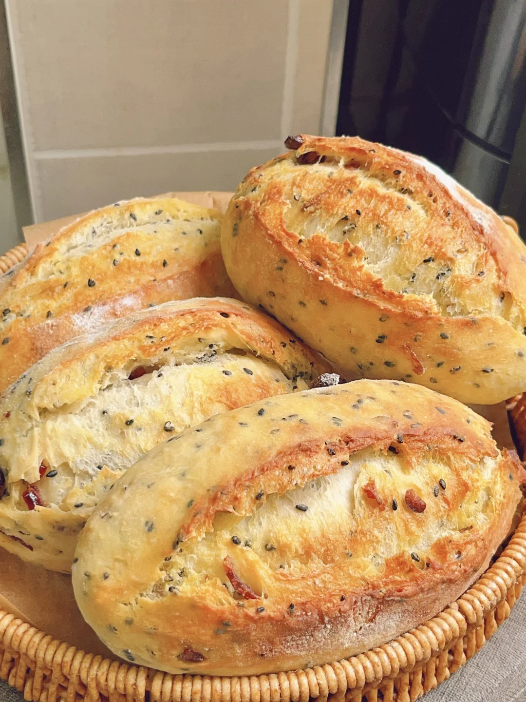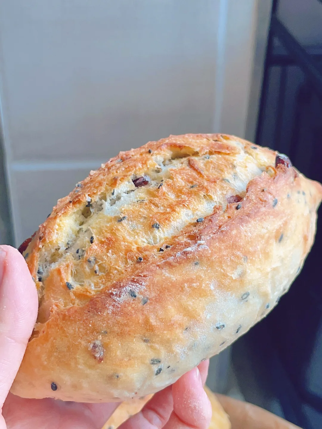 300高筋面粉、3g酵母、3g盐、15g黑芝麻、230g牛奶、蔓越莓适量