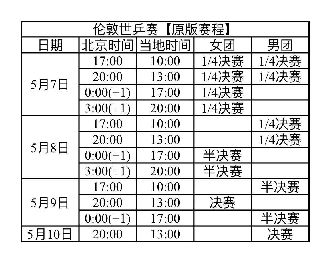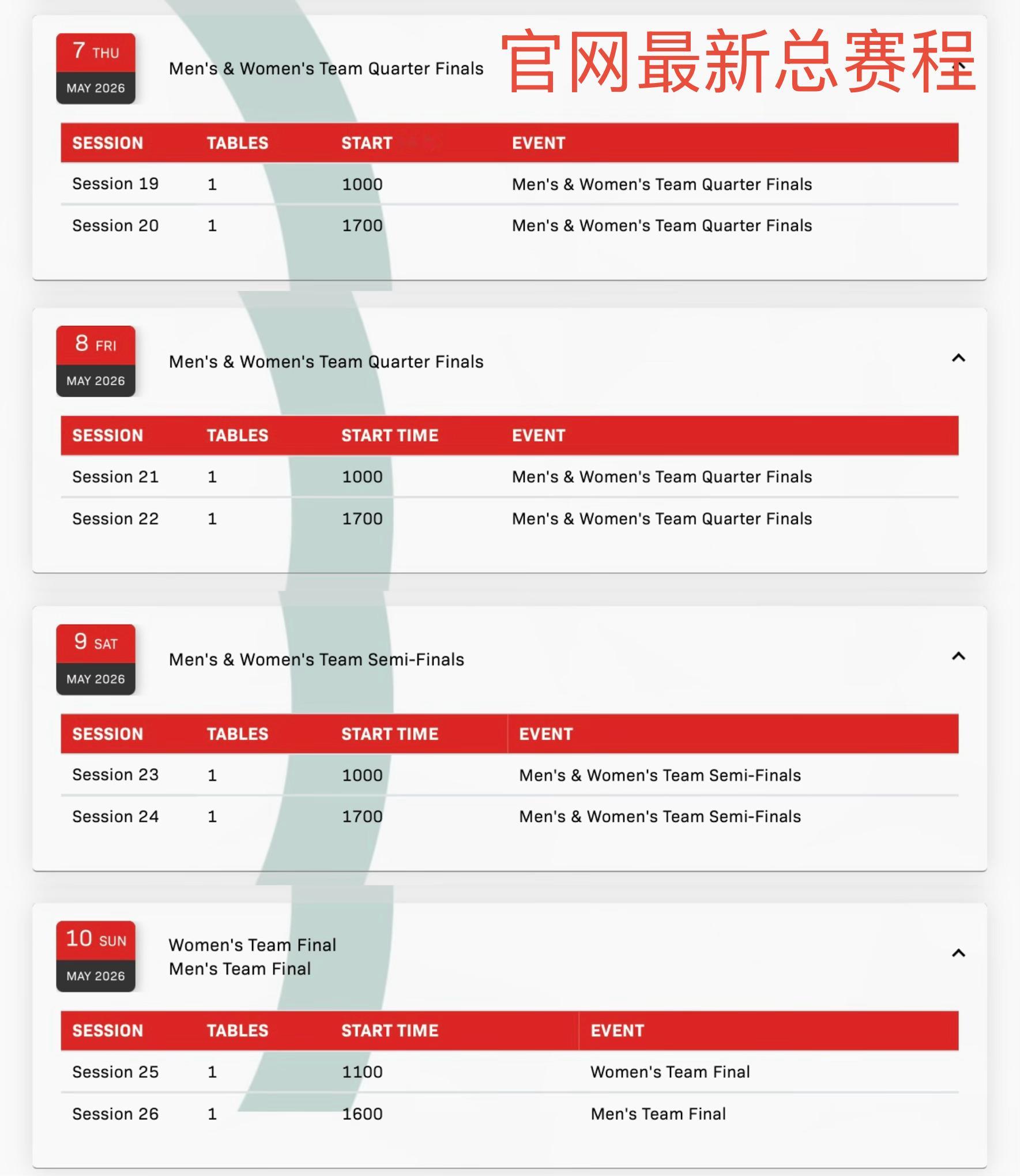 最新变更的赛程如下:【男、女团1/4决赛】北京时间5月7日17:00、0:00(+1)(当地时间5月7日10:00、17:00)北京时间5月8日17:00、0:00(+1)(当地时间5月8日10:00、17:00)【男、女团半决赛】北京时间5月9日17:00、0:00(+1)(当地时间5月9日10:00、17:00)【🥇女团决赛】北京时间 5月10日18:00(当地时间5月10日11:00)【🥇男团决赛】北京时间5月10日23:00(当地时间5月10日16:00)