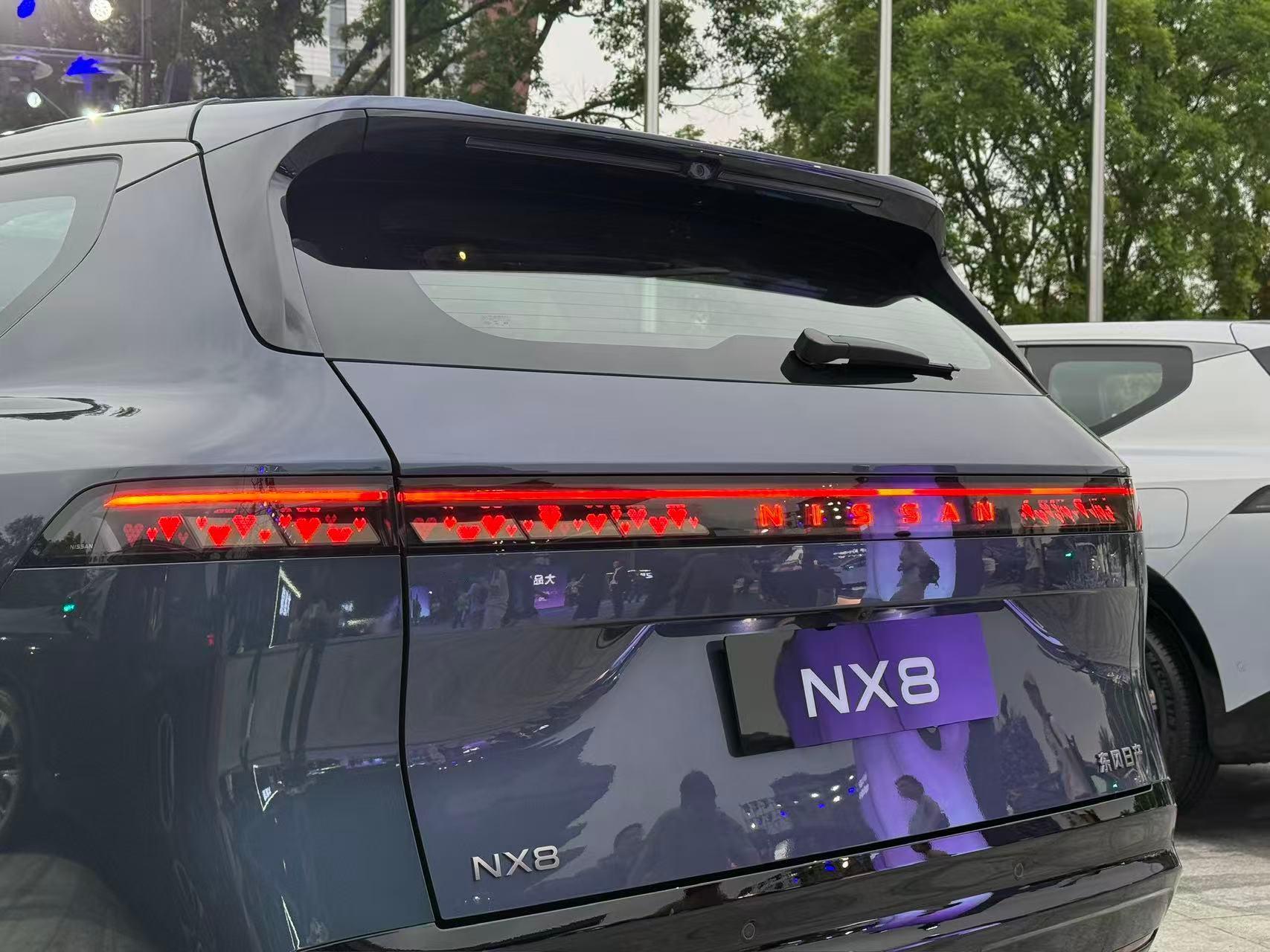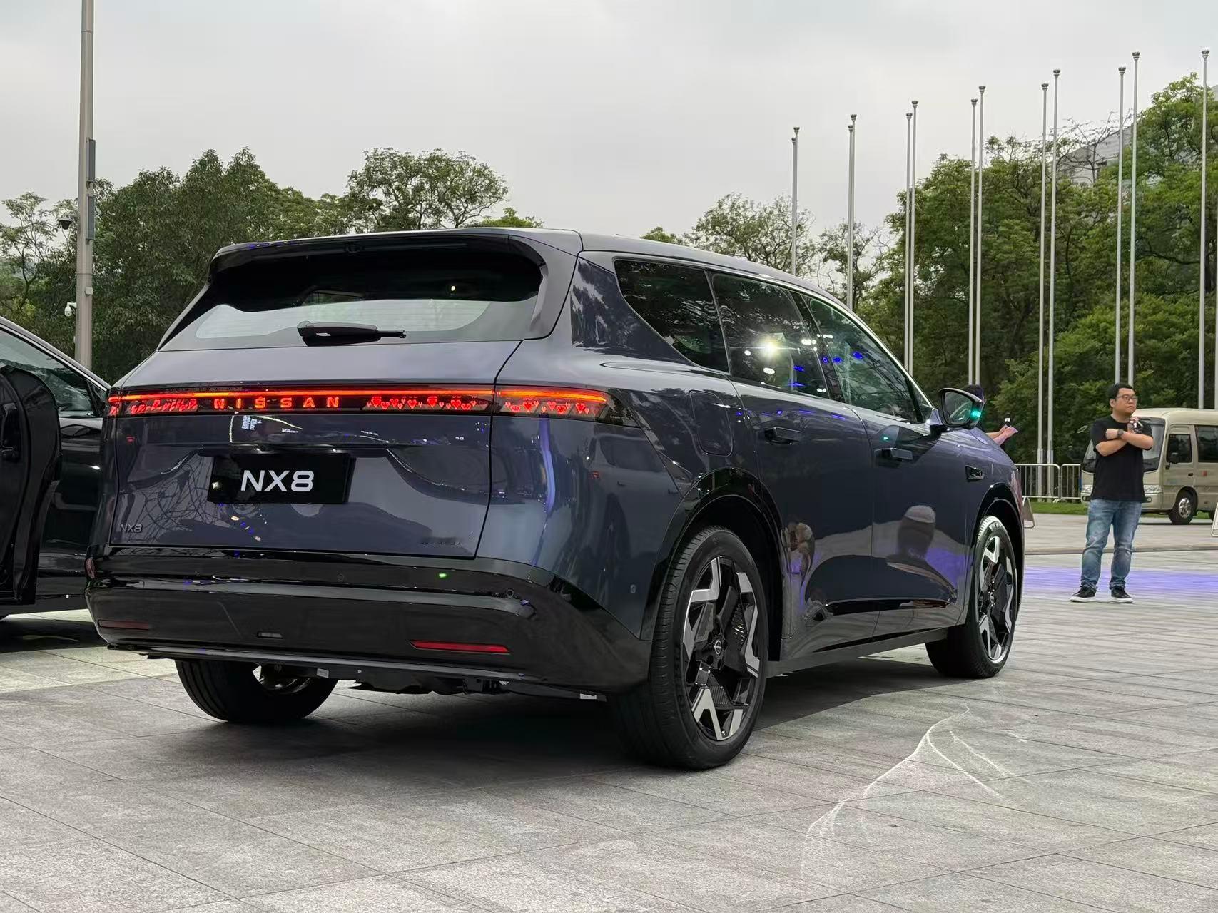 1【外观辨识度高】NX8采用日产N系列新能源家族设计,定位大五座SUV,车身尺寸4870×1920×1680mm,轴距2917mm,比例舒展、气场沉稳。前脸为封闭式电感格栅,搭配2.4米同级最长贯穿式星环日行灯与可发光Logo,寰宇双子星LED大灯层次分明。侧面线条流畅,隐藏式门把手+悬浮式车顶,弱化庞大感。车尾配备2064颗OLED光源的贯穿式尾灯,支持自定义灯语,夜间视觉效果惊艳。