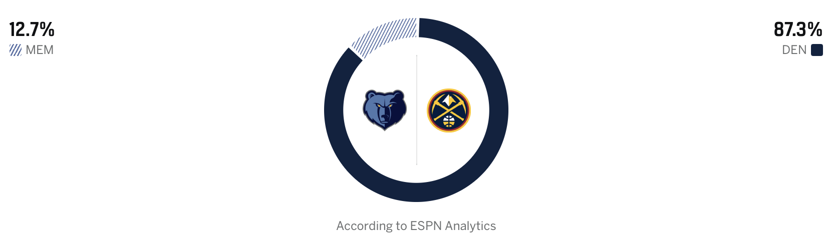 ESPN预测灰熊vs掘金:灰熊胜率12.7%,掘金胜率87.3%