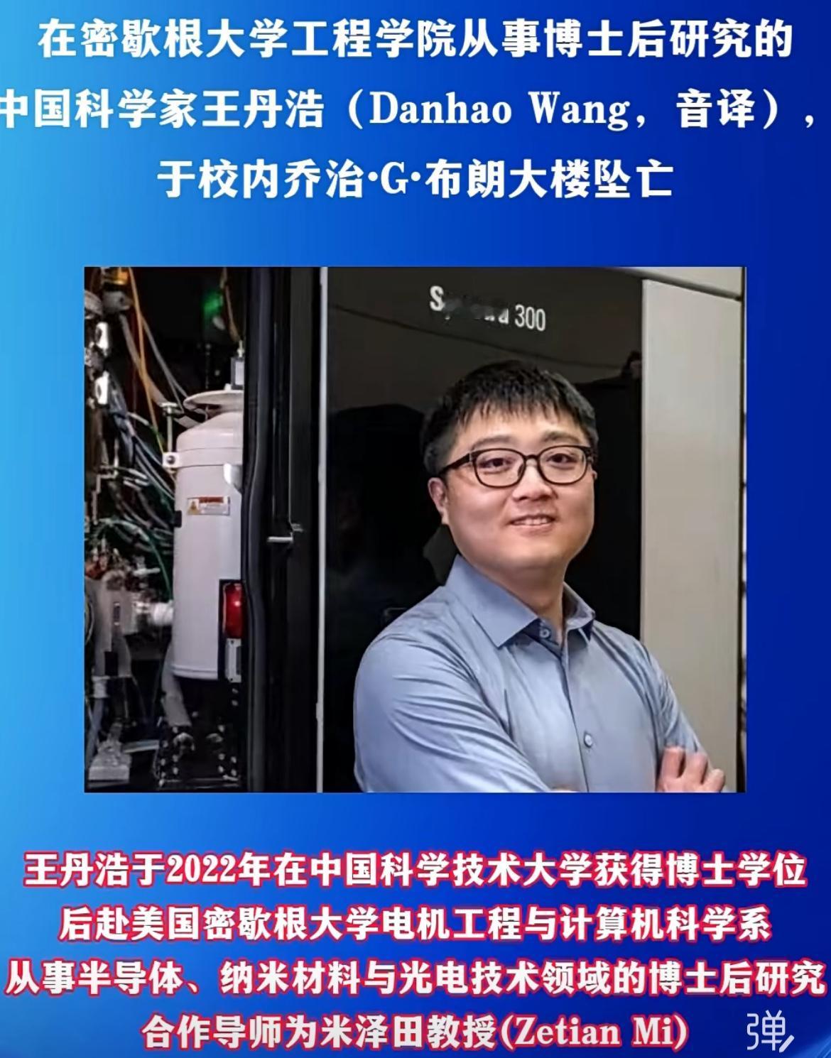 令人痛心,中国半导体材料研究博士后王丹浩在美国密歇根大学坠楼身亡,生前曾遭美国联邦执法人员高强度背景调查与盘问。