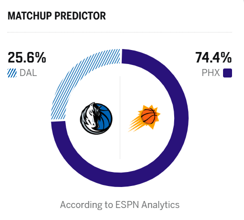 ESPN预测明日比赛:太阳胜率高达74.4%,独行侠胜率25.6%