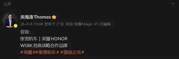 越来越多的中国品牌赞助张雪机车荣耀张雪机车战略合作张雪机车刚在WSBK拿了双冠,中国品牌就开始扎堆来赞助了,这不,荣耀刚官宣成为首席战略合作伙伴,这是要打算推出荣耀张雪联名手机了吗?
