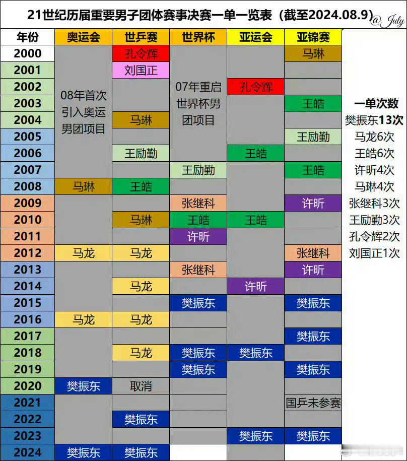 乒乓球男单三大赛(奥运+世乒赛+世界杯)单打冠军数排名:1. 马龙(中国):8