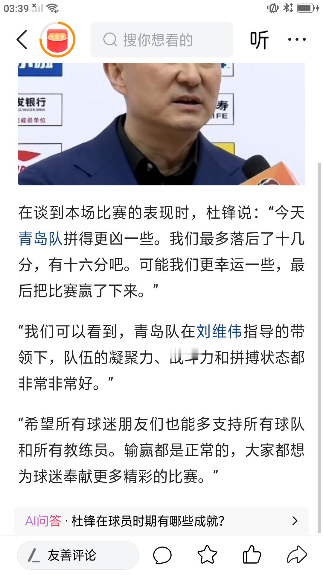 广东队客场加时险胜青岛,战绩排名再次重返前四。赛后广东队主教练杜峰接受媒体采访时说:这是一场非常激烈精彩的比赛,今天青岛队主场拼的很凶,我们最多时落后十几分,非常被动。可能是我们比对方更幸运一些,最后赢下了这场比赛。这支年轻的青岛队在刘维维指导带领下,凝聚力和战斗力很强,他们状态也非常好。希望球迷朋友能多支持所有球员和教练员,比赛输赢都是正常的。