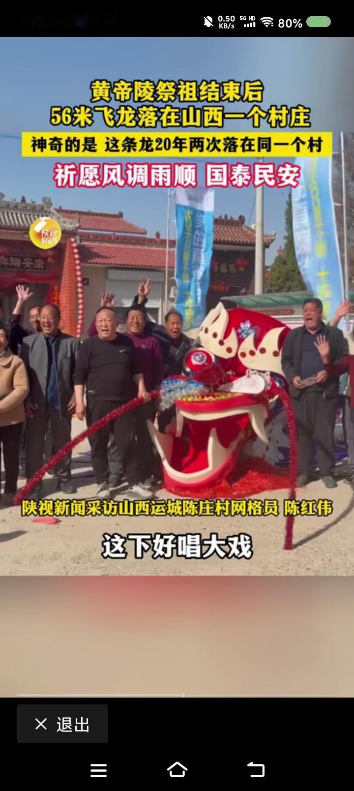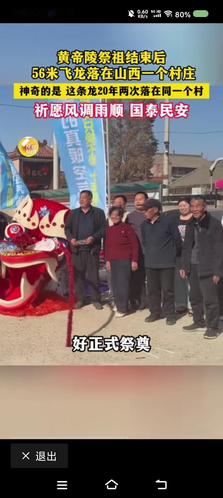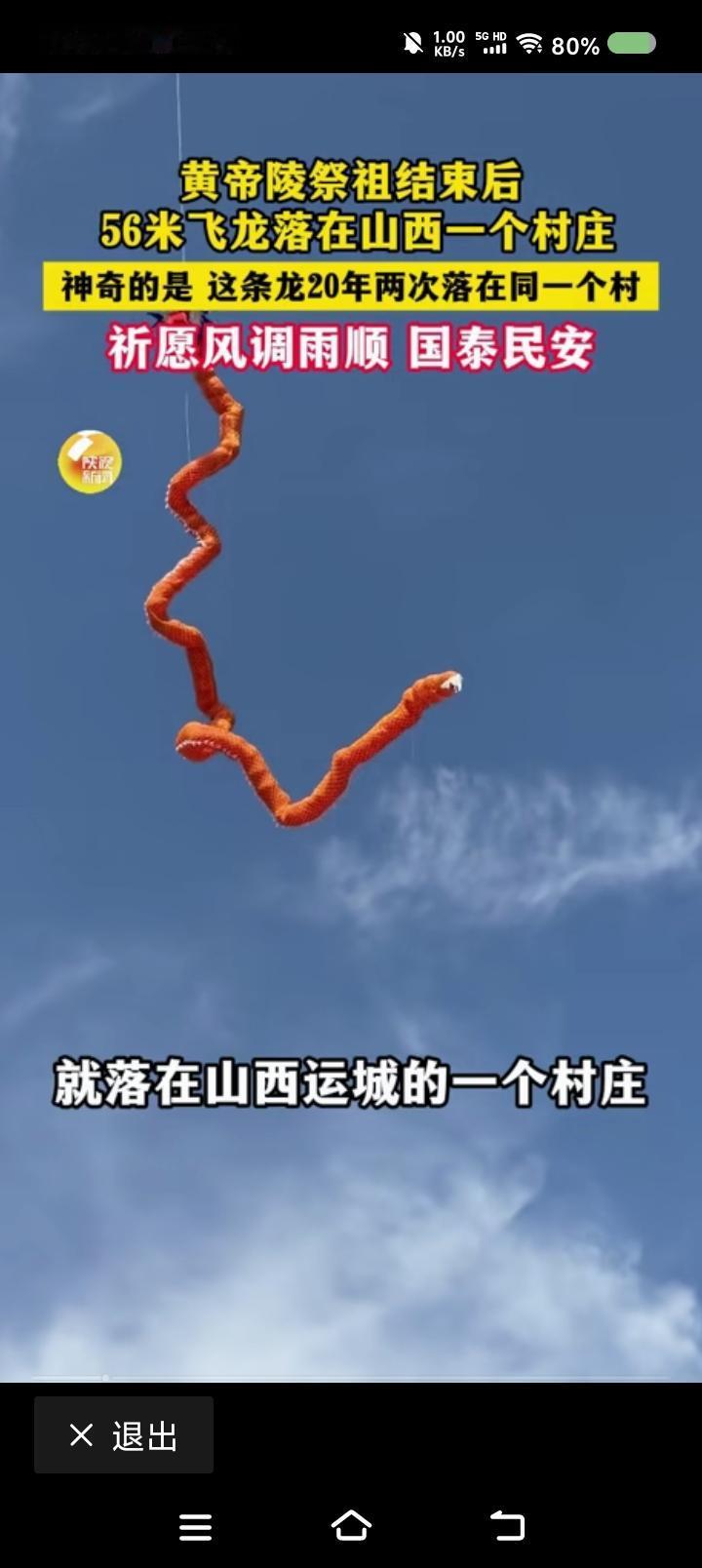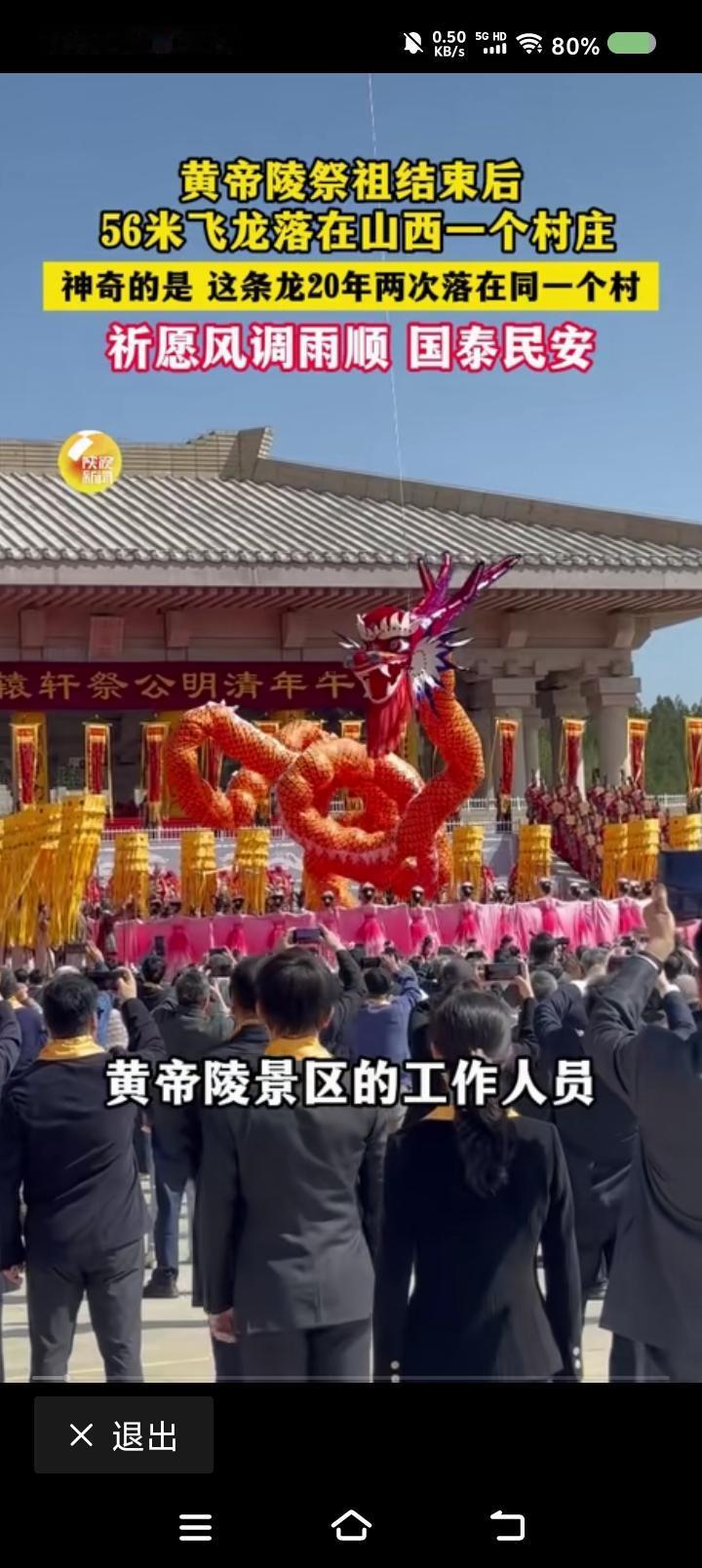 据报道,今年的黄帝陵祭祖仪式之后,那条56米长的飞龙飞过200多公里,再次降落山西临猗县北景乡陈庄村。村民大喜,计划永久保存。上次降落在2005年。