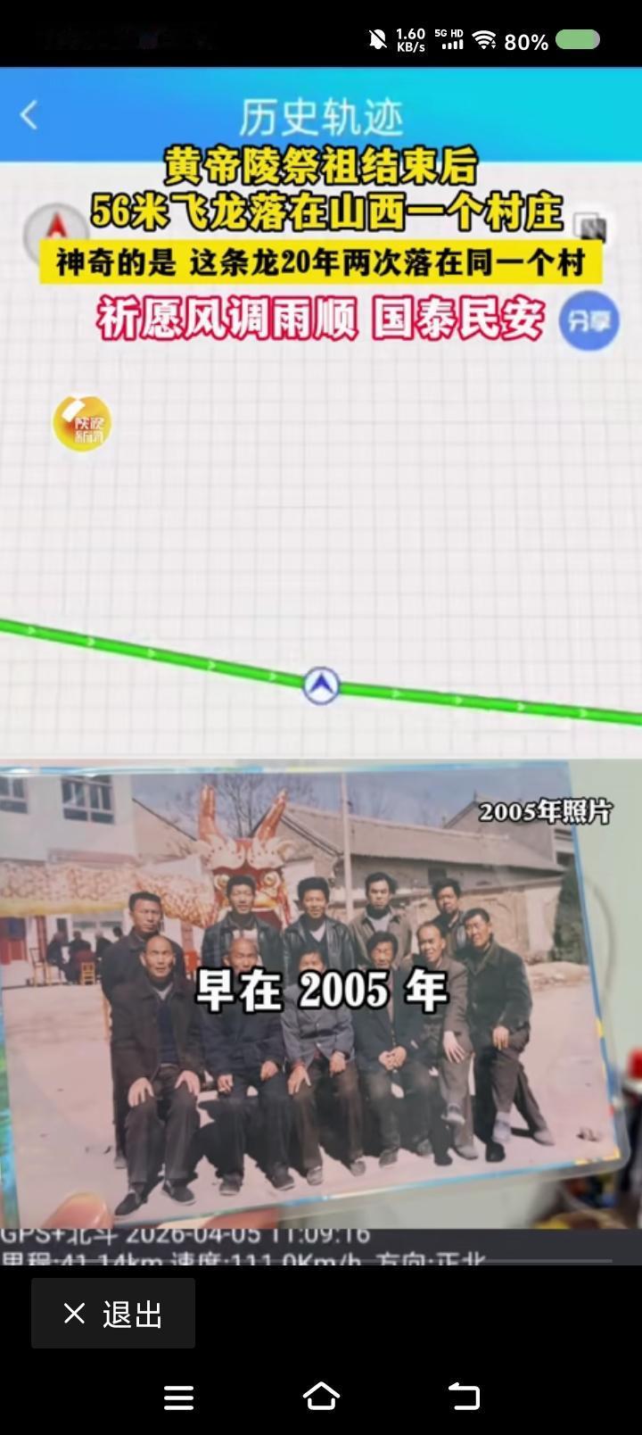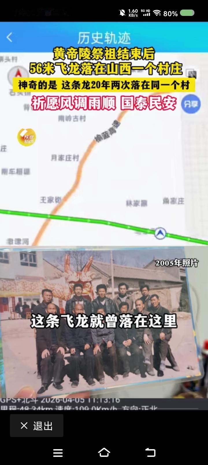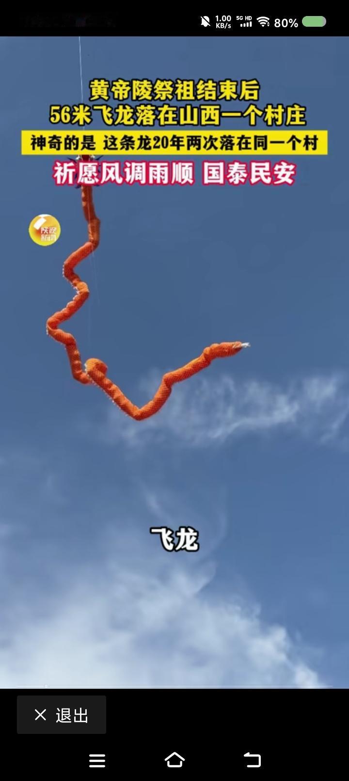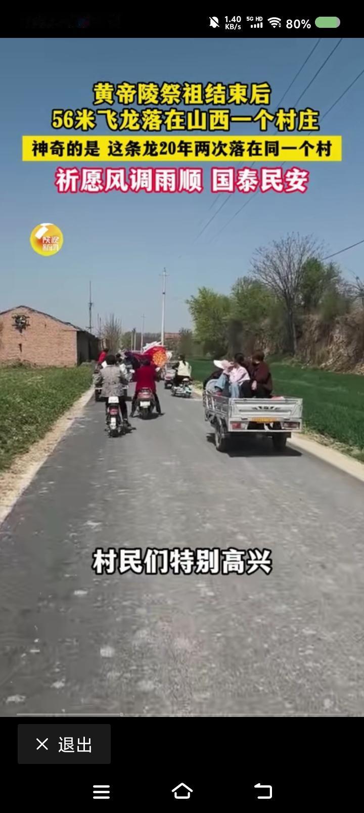 据报道,今年的黄帝陵祭祖仪式之后,那条56米长的飞龙飞过200多公里,再次降落山西临猗县北景乡陈庄村。村民大喜,计划永久保存。上次降落在2005年。