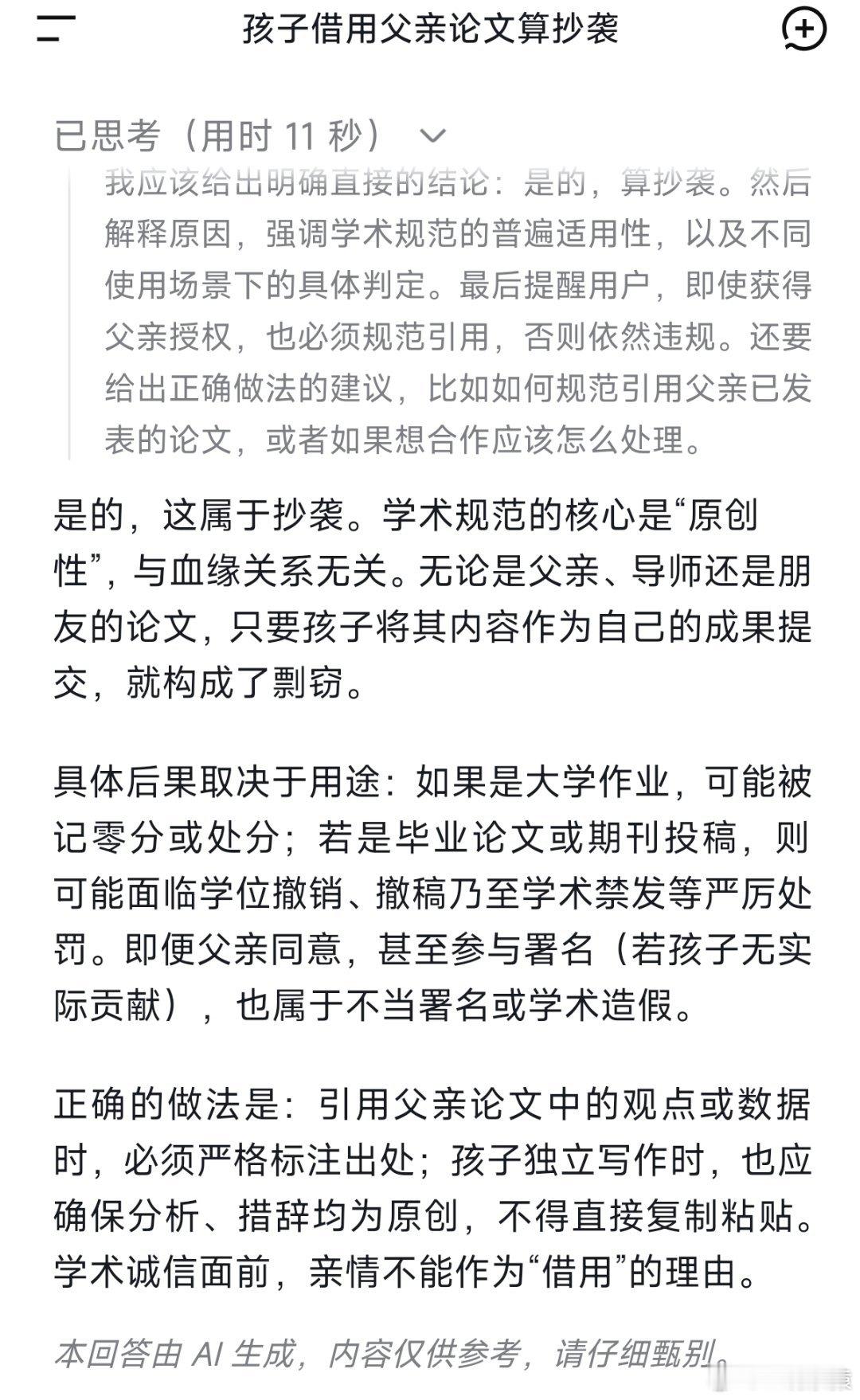 对网传贾某某论文抄袭等启动调查问了下deepseek,孩子借用父亲的论文算抄袭吗?它的回答是属于抄袭,学术规范的核心是“原创性”,与血缘关系无关。无论是父亲、导师还是朋友的论文,只要孩子将其内容作为自己的成果提交,就构成了剽窃。