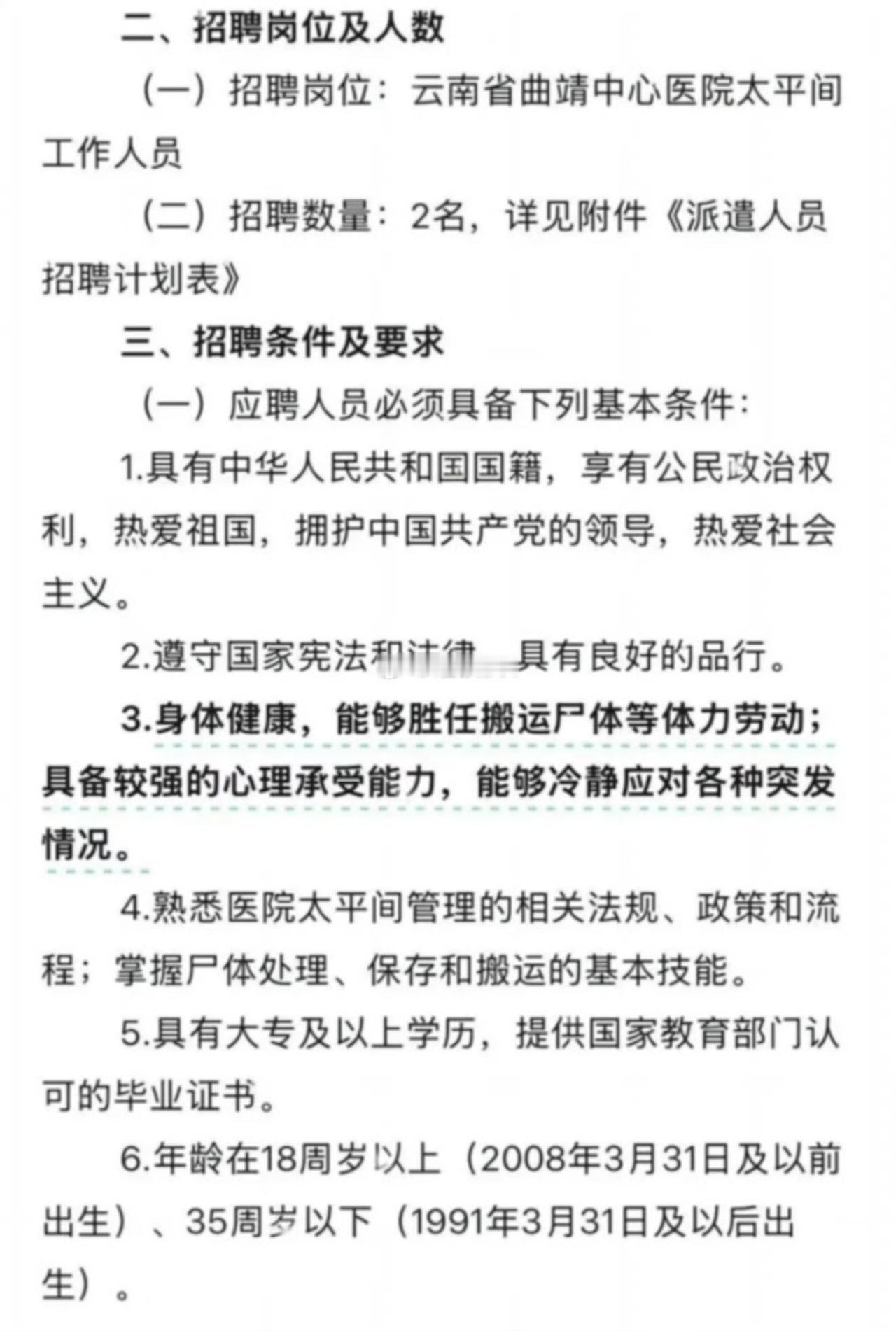 云南曲靖一医院太平间招聘搬尸工,4000 的月薪竟然引来上百人报名。还有更离谱的要求,学历要求大专以上,年龄 35 岁以下,需要经过笔试和面试,择优录取。这个工作属于第三方劳务派遣,没有编制,要上夜班,如果扣除五险一金,吃住估计也剩不了几个钱。可是连这么一个一般人都会忌讳的工作,却引来了上百人报名,可见现在的工作有多难找。联想到前几天高铁安检员竟然还要花几万块钱才能上岗,看到这也能理解了。