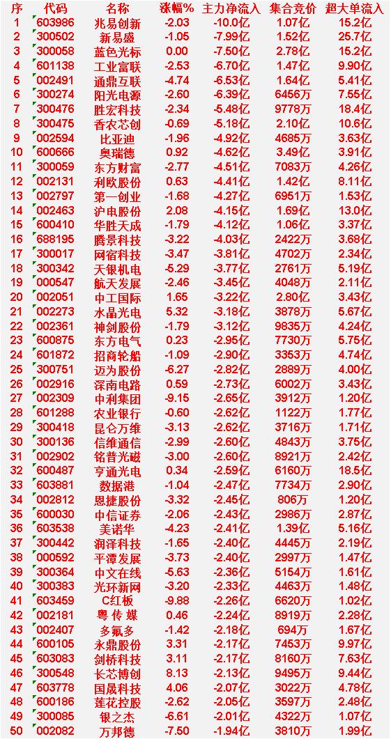 4月9日中午收盘,主力资金“大幅卖出”的50名单: