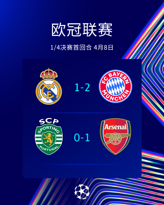 欧冠1/4决赛首回合战况:皇马1-2拜仁,葡萄牙体育0-1阿森纳,巴萨0-2马竞