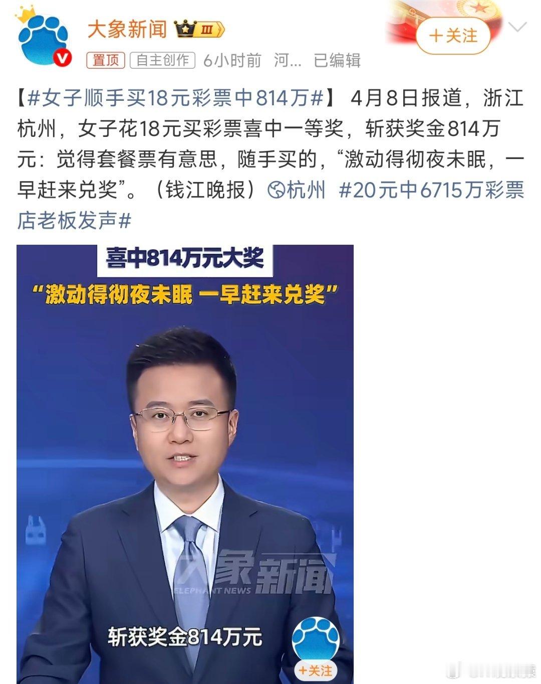 女子顺手买18元彩票中814万今天彩票中大奖的有点多啊。