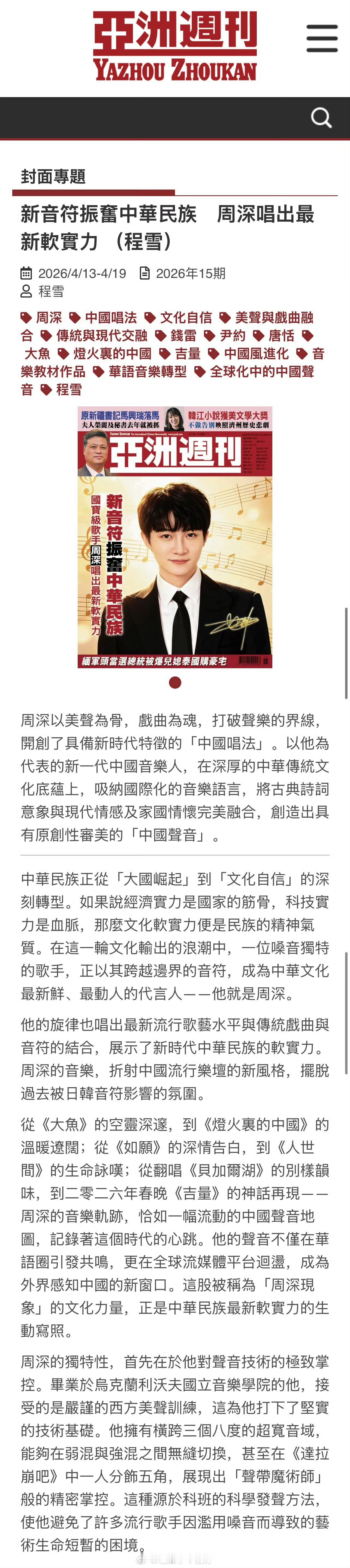 周深登上了亚洲周刊封面,好大的篇幅,实力歌手周深就这样出圈