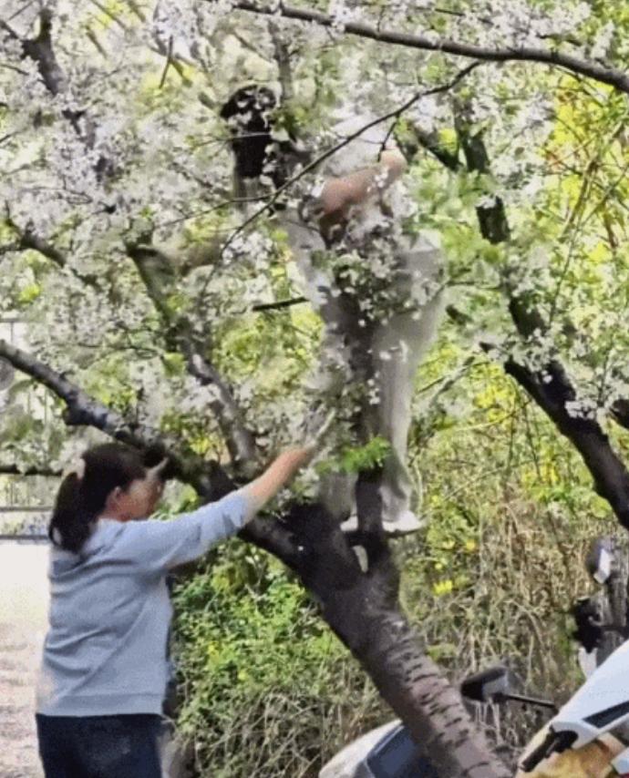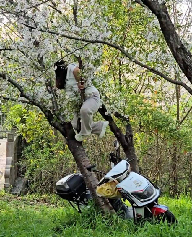 当时,她跟同伴一起,看着满树粉白的樱花,就想站在树干上拍那种“人在花丛中”的氛围感照片,同伴在树下帮她举着手机,她倒好,完全没把公园“禁止攀爬树木”的牌子当回事,手脚并用就爬了上去。