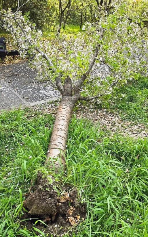 周围的游客都看傻了,好好的一棵大树就这么毁了,大家都觉得可惜得不行,可有意思的是,这女子爬起来后,第一反应不是看树,也不是顾自己疼不疼,而是怕要承担责任,拉着同伴骑上电动车就跑了,留下那棵倒伏在地、根系全断的樱花树,孤零零地躺在草地上。