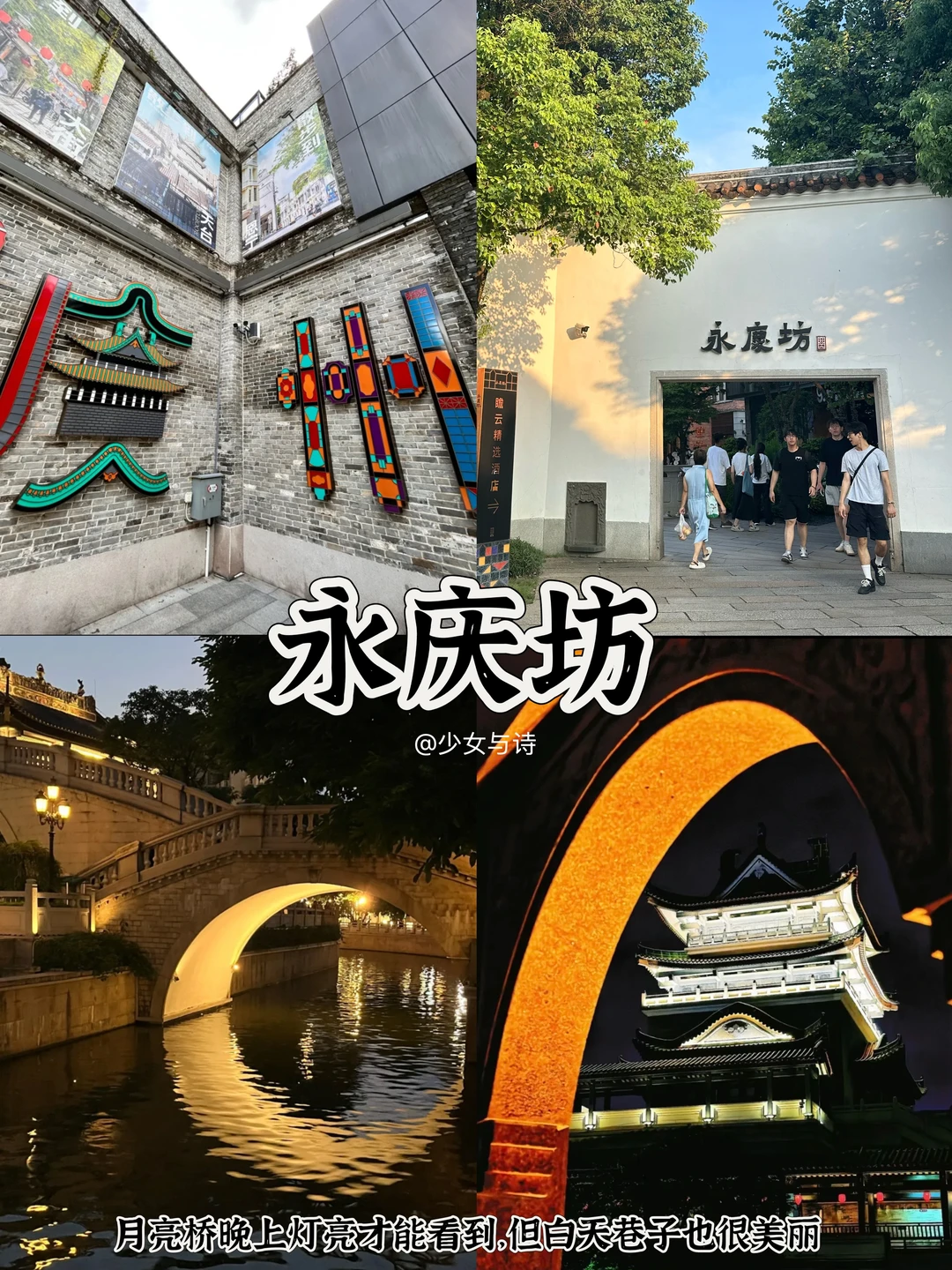 📍永庆坊:西关骑楼与现代创意店铺交融,岭南园林点缀其间,夜晚月亮桥氛围感拉满。