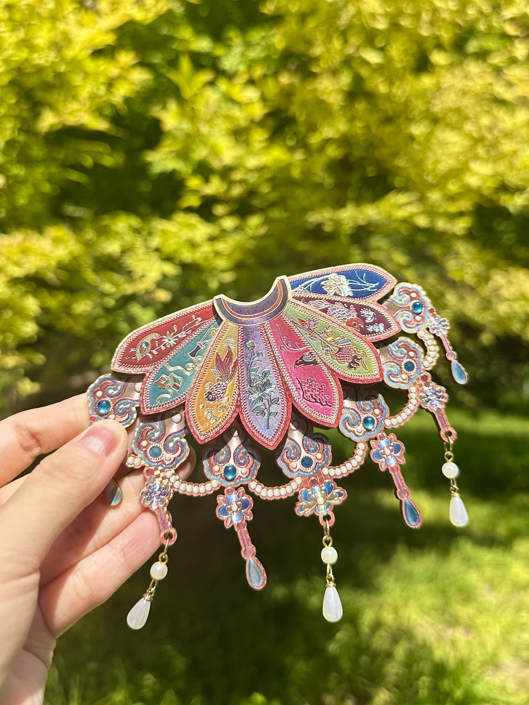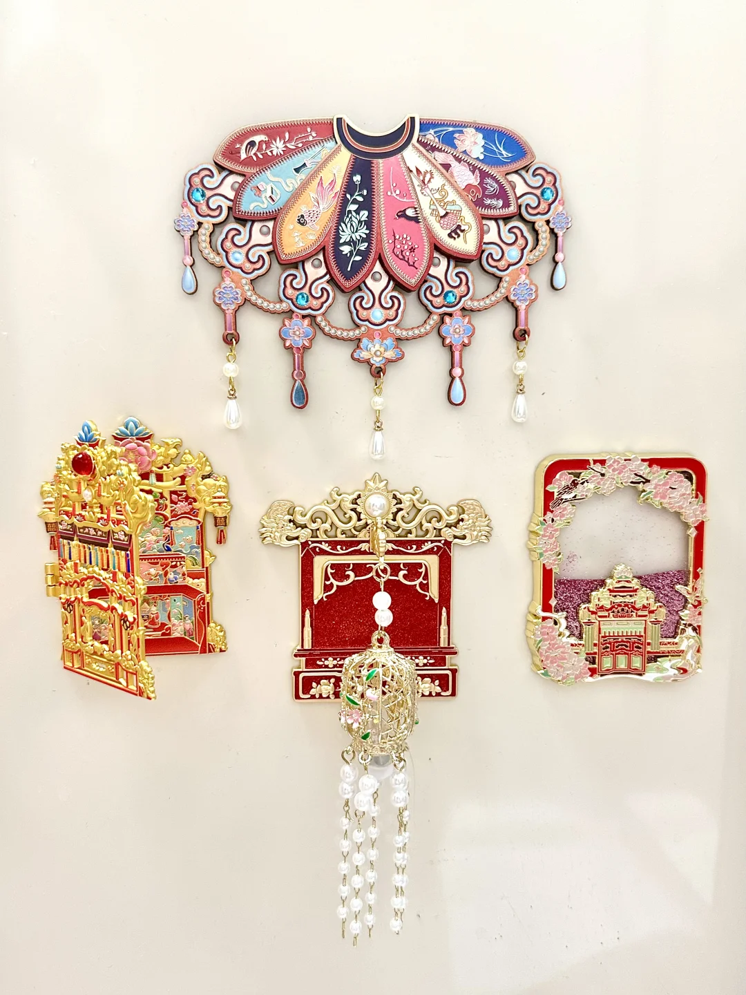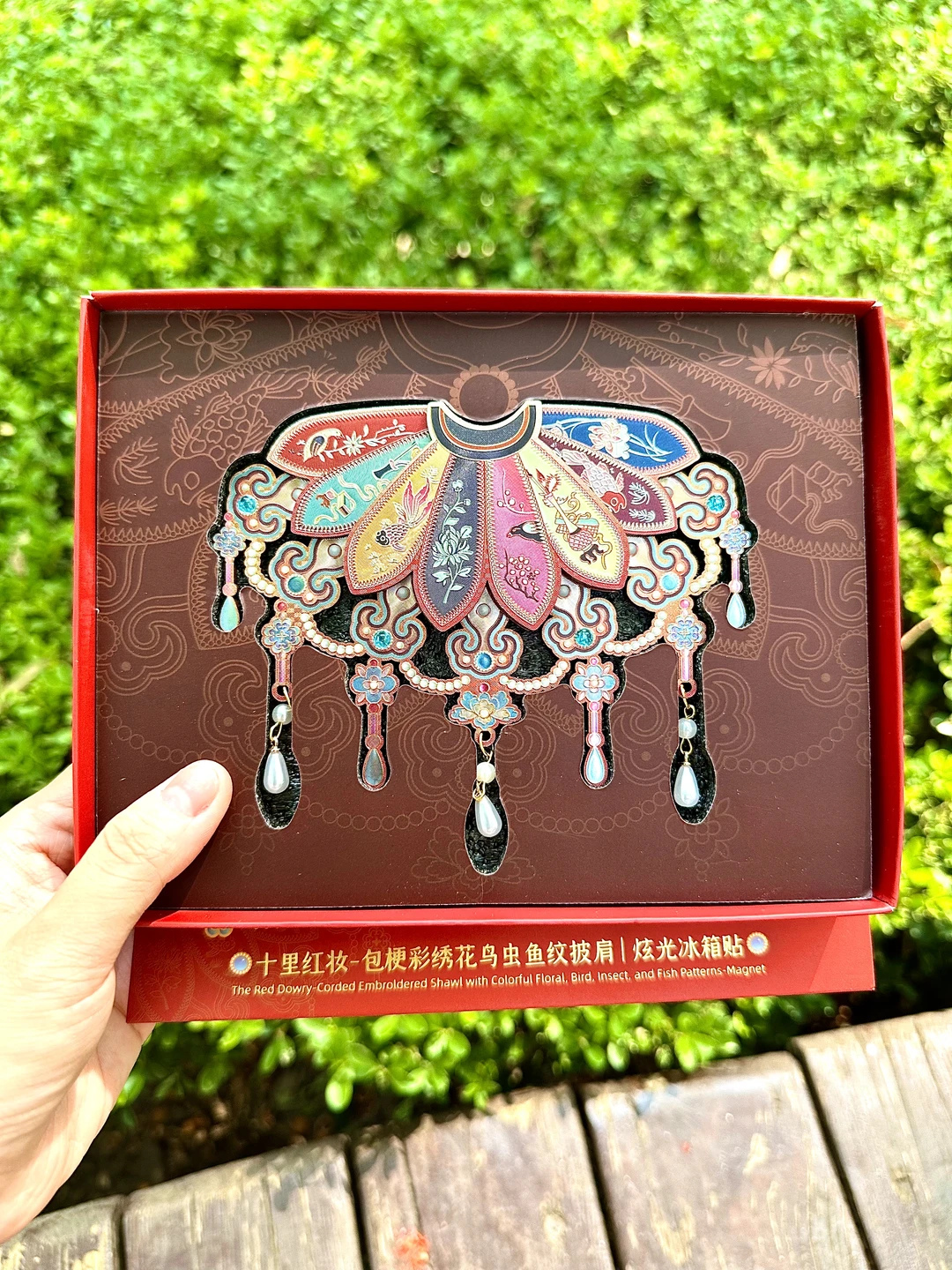 ✨包梗彩绣花鸟鱼虫纹披肩:刺绣细得能看清鸟羽纹路,红底配金纹,贴在冰箱上像挂了片微型云锦,每次开冰箱都像拆中式盲盒。