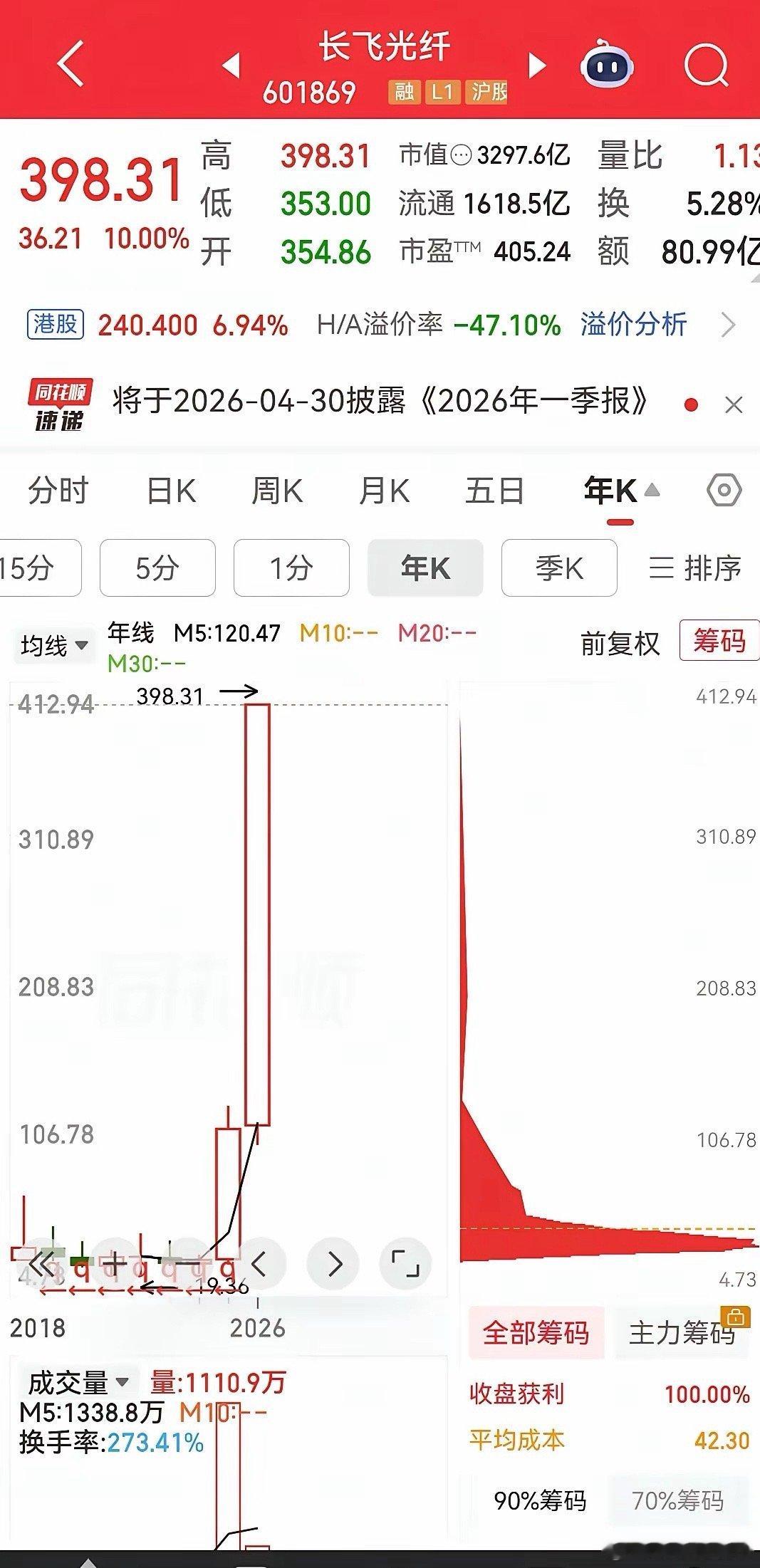 长飞光纤,长飞光纤疯狂到无极限,作为3297.6亿的超大权重市值股,在近一年来的