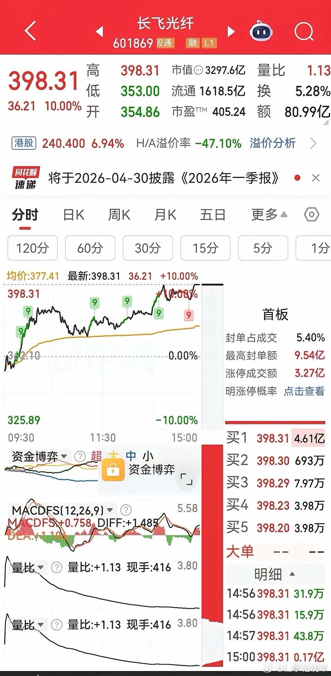 长飞光纤,长飞光纤疯狂到无极限,作为3297.6亿的超大权重市值股,在近一年来的涨停板次数,直接刷新所有散户的认知,达到了惊人的26次,这是什么概念,比小盘股中的妖股,还要厉害!而且在今天尾盘的最后3分钟里,股价再次拉升至涨停板,真是强到无敌手,涨停板上封单资金为4.61亿。该股票在一直以来的综合上涨过程中,是非常符合市场规则的,在不触摸警示风险的情况下,就一直进行着震荡调整的拉升上涨行情。长飞光纤股价,在今年的A股市场上,涨幅近4倍,在今年的港股市场上,涨幅超5倍以上,可以说是一直在涨,涨不停哈。长飞光纤在市盈率方面,也是非常之高的,达到了405.24PE。今天我把常飞光纤股票的股东,做了一个详细了解,怪不得股价会一直涨,原来它的前三大股东,都是家J长,而且三大股东占比合计,达到了惊人的86%!对于三位家J长的具体持股的占比情况,分别如下:1️⃣香港中央结算(代理人)有限公司,持股占比50.91%;2️⃣中国华信邮电科技有限公司,持股占比21.72%;3️⃣武汉长江通信产业集团股份有限公司,持股占比14.35%;