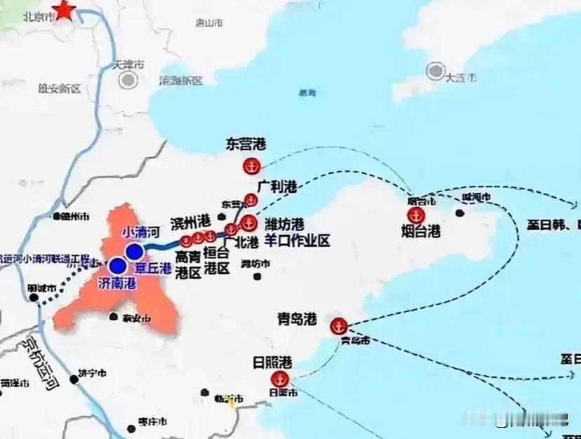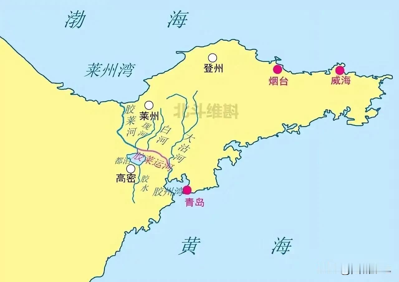 ④“胶莱运河”设想工程:打通胶州湾与莱州湾之间的运河航道,实现横跨山东半岛的水路互通设想方案。