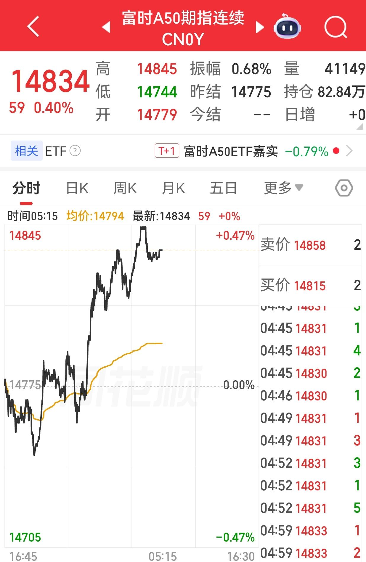 富时中国A50指数期货夜盘收涨0.40%,报14834点。