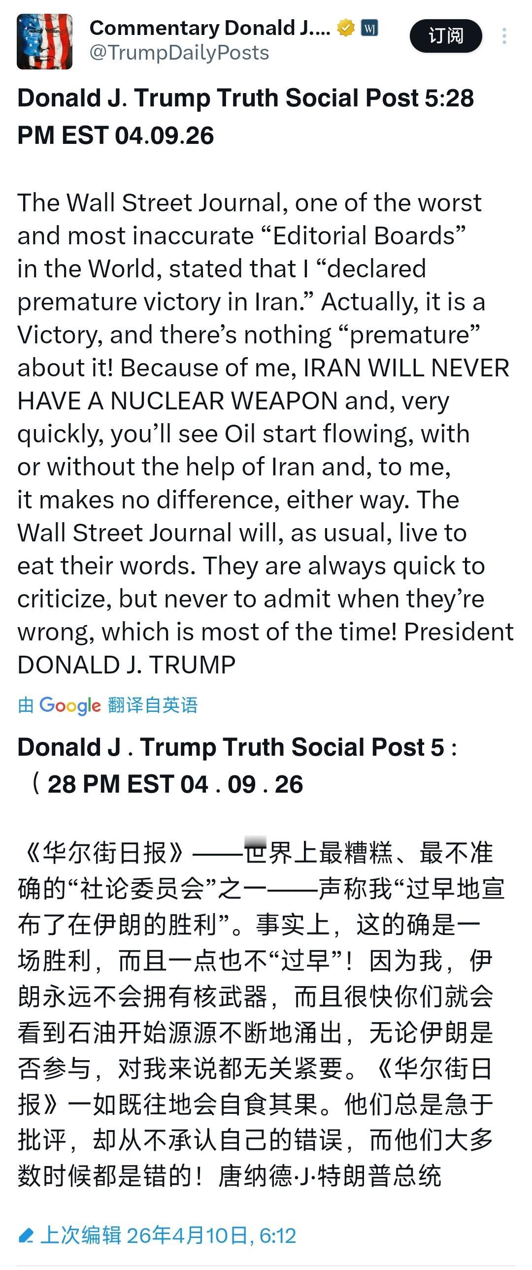 特朗普今天(北京时间4月10日)发文写道:“《华尔街日报》——世界上最糟糕,最不准确的‘社论委员会’之一——声称我‘过早地宣布了在伊朗的胜利’。事实上,这的确是一场胜利,而且一点也不‘过早’!因为我,伊朗永远不会拥有核武器,而且很快你们就会看到石油开始源源不断地涌出,无论伊朗是否参与,对我来说都无关紧要。《华尔街日报》一如既往地会自食其果。他们总是急于批评,却从不承认自己的错误,而他们大多数时候都是错的!”