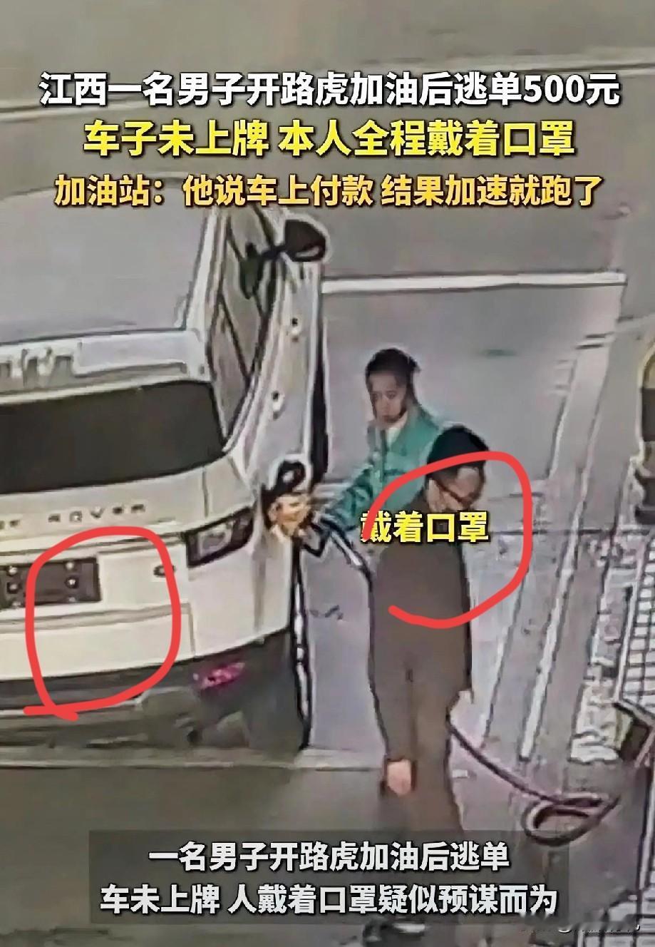 白色路虎车主加油逃单,未挂车牌,嫌疑人很有经验,专门做这种事,嫌疑人很狡猾,身高175左右,中年男子,穿灰色上衣,戴黑色口罩。