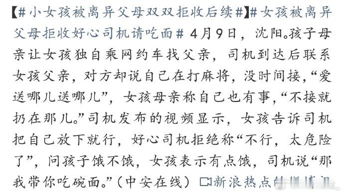 小女孩被离异父母双双拒收后续 看到没,伤害孩子最深的从不是同学老师社会上的人,往往就是父母一句 “离婚了” 就想抹掉血缘与法定义务,本质是自私到骨髓、把成年人的恩怨全压在无辜孩子身上,让小小年纪就尝尽被全世界抛弃的绝望法律早写死:抚养义务不因离婚消失,拒不履行、情节恶劣就是遗弃罪,可判五年以下;别只靠司机怒斥、社会谴责,必须撤销监护权、强制执行抚养费、纳入失信黑名单,让这对冷血父母付出代价!别让孩子的 “懂事”,成了成年人逃避责任的遮羞布